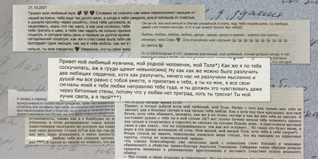 Пока Гомзяков был в СИЗО, его девушка (а потом и жена) вообще всячески старалась сделать так, чтобы ему стало легче. Особенно важными в этом смысле оказались письма, которые первое время были единственным способом поддерживать контакт. Анатолий и Соня очень любили путешествовать — и Резчикова придумала в конце каждого письма рассказывать и показывать, где они были в этот день одного из предыдущих годов.