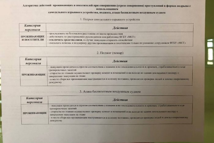 Алгоритм призывает при подрыве СВУ «проследовать на безопасное расстояние от места происшествия», следовать указаниям сотрудника студгородка, оказывать помощь окружающим только по его разрешению, отключить телефон и сохранять спокойствие.