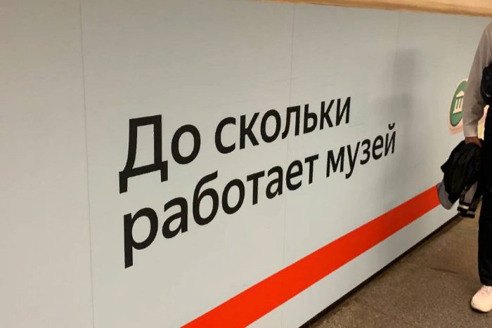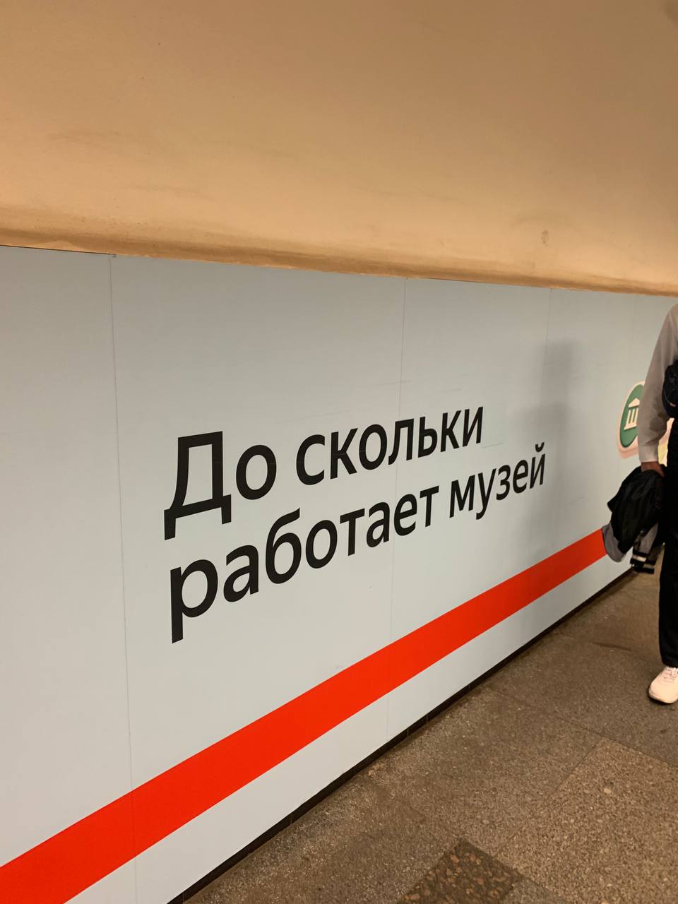 В вестибюле станции метро «Невский проспект» на набережной канала Грибоедова произошла путаница в написании оборота «до скольких» на рекламном баннере «Яндекс.Карт», заметил читатель «Бумаги».