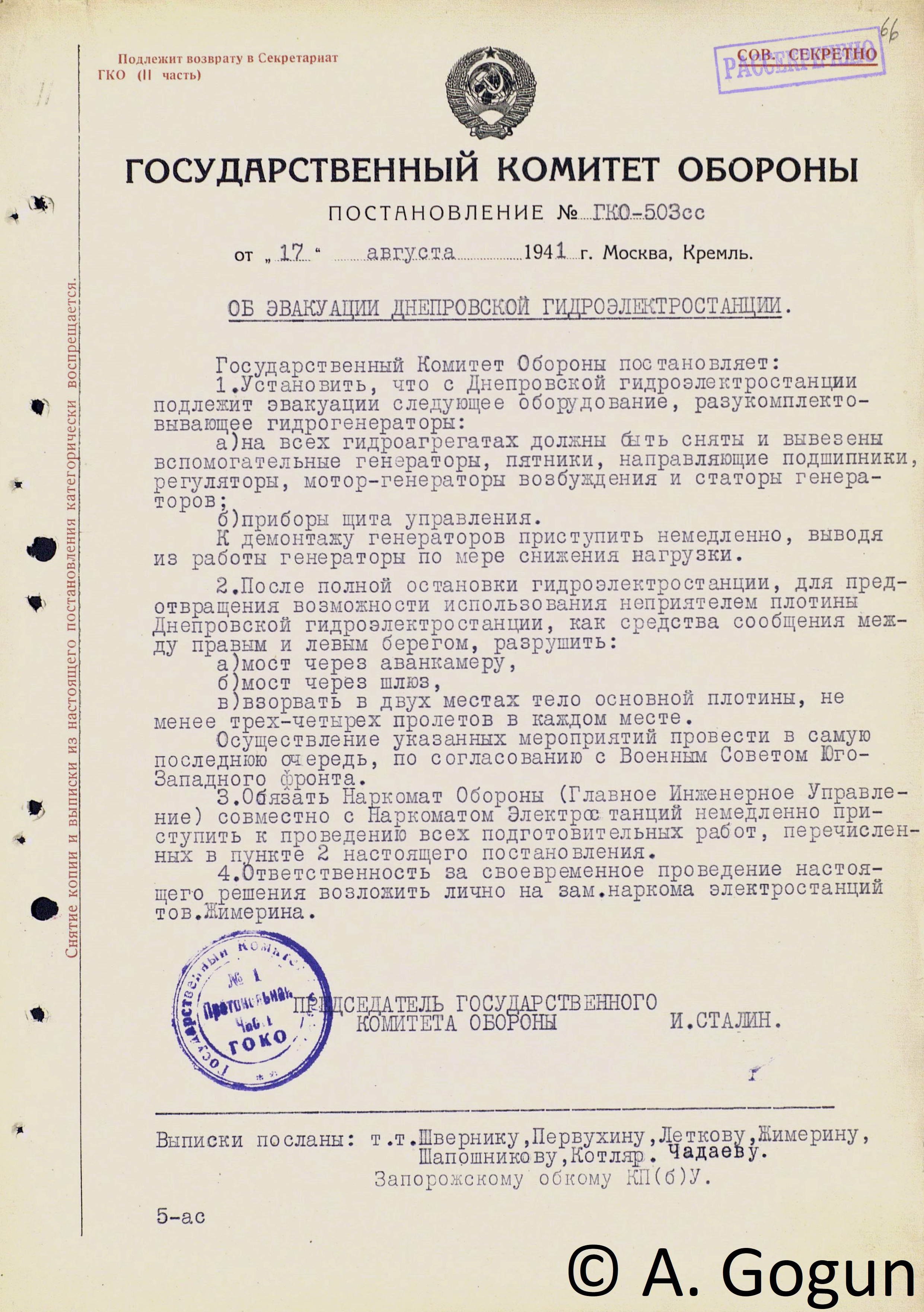 17 августа Государственный комитет обороны принял совершенно секретное постановление №503 "Об эвакуации Днепровской гидроэлектростанции" – этот документ хранится в РГАСПИ и публикуется впервые: