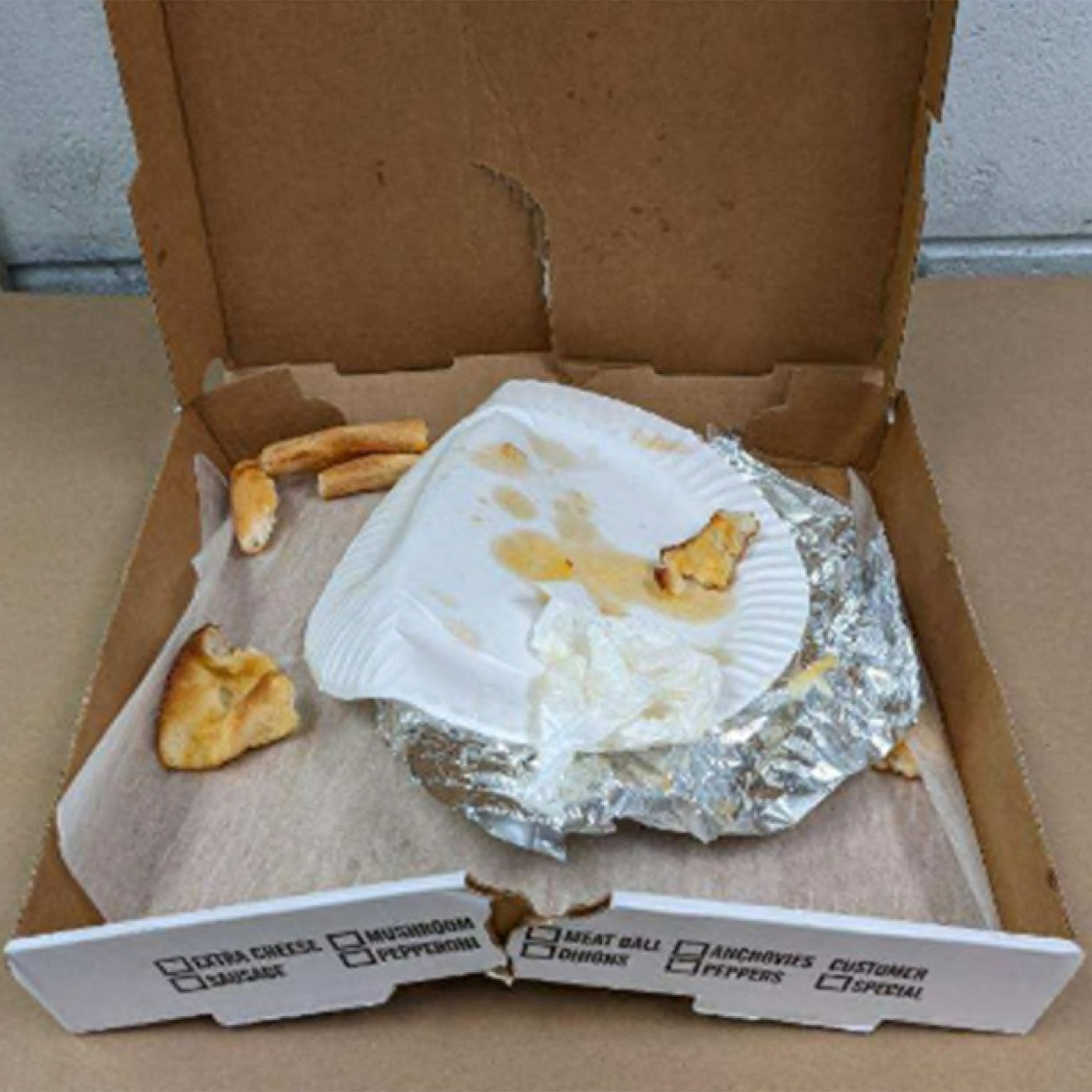 Suffolk County Court / Reuters / Scanpix / LETA Коробка с остатками пиццы, которая позволила получить ДНК Хойерманна. Фото было обнародовано в ходе судебных слушаний