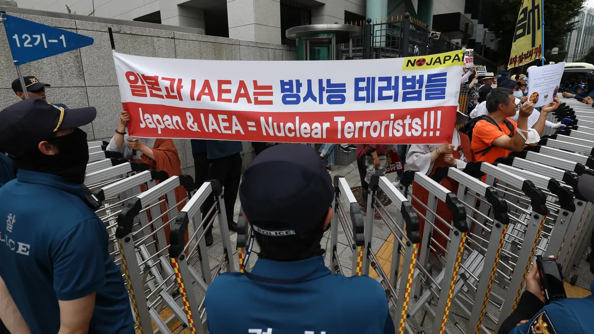 South Korean protesters participate in a rally against the Japanese government's decision to dump radioactive wastewater from the damaged Fukushima nuclear power plant into the Pacific Ocean, on July 08, 2023 in Seoul, South Korea. Photo by Chung Sung-Jun/Getty Images