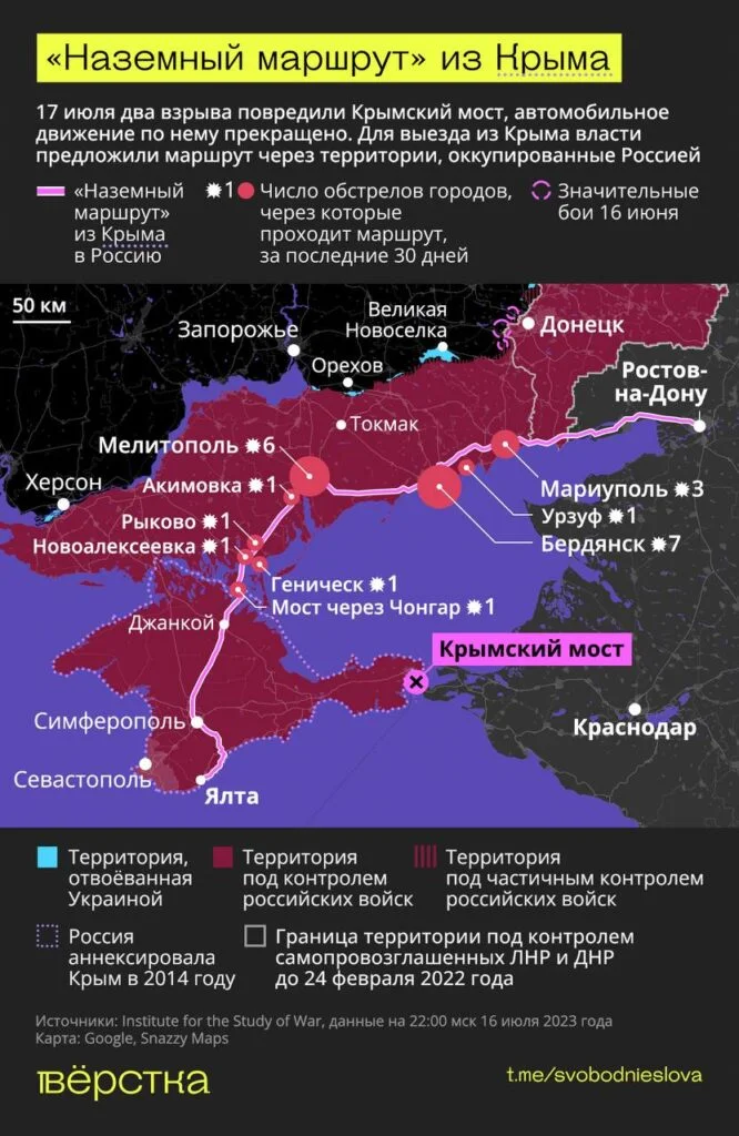 Населённые пункты, расположенные вдоль «наземного маршрута» из России в Крым в оккупированных частях Донецкой, Херсонской и Запорожской областей Украины были обстреляны минимум 22 раза за последние 30 дней, выяснила «Вёрстка»