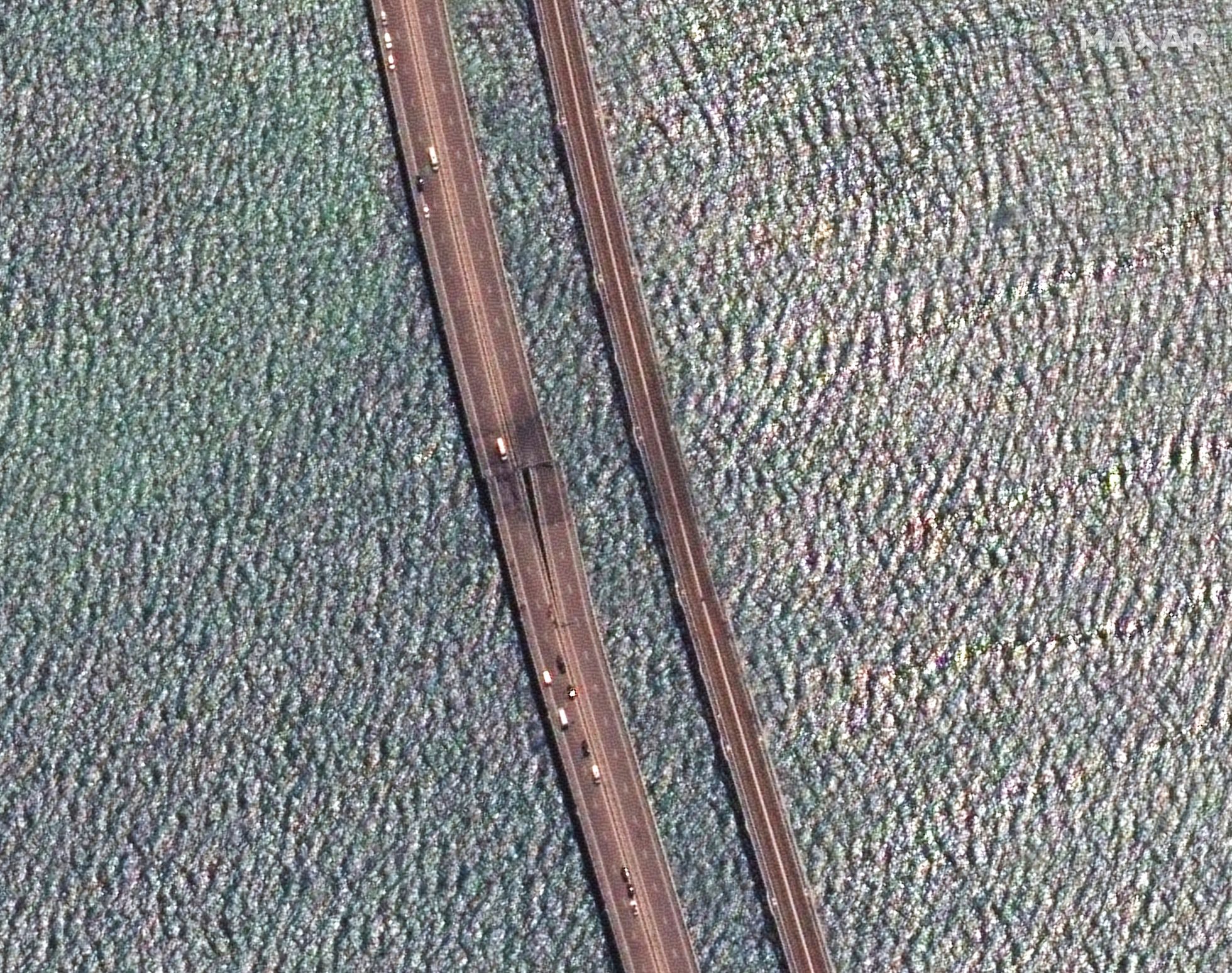Косвенным аргументом в пользу версии о дронах служат видео и фото последствий взрывов: можно уверенно сказать, что те произошли под дорожным покрытием моста. Есть также спутниковый снимок, сделанный в 12 утра по московскому времени 16 июля, на котором изображены шесть неизвестных лодок — в теории они и могли быть теми самыми беспилотниками. Лодки запечатлены в западной части Черного моря, примерно в 75 километрах от острова Змеиный. Пять из них движутся на восток, и по их курсу можно предположить, что они собираются обогнуть Крым. Одна лодка идет в противоположном направлении. Расстояние от точки, где спутник засек лодки, до Крымского моста — около 520 километров.