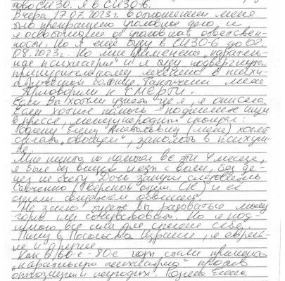 «Вчера 17.07.2023 мне подписали „смертный приговор“, уголовное дело в отношении меня прекращено, но применена ко мне „карательная психиатрия“, я буду помещена в психиатрическую больницу, — пишет Елена Родина. — До 02.08.2023 я ещё буду находиться в СИЗО-6 до вступления определения 2-го Западного окружного военного суда в законную силу. Если вы хотели узнать и порадоваться, то злорадствуйте. Если хотите помочь, то необходимо поднять информационный шум: „Спасите Родину“. Меня хотят сделать „овощем“, заколоть препаратами в психушке. Возможно это последние письма мои в светлой памяти и твердом уме».