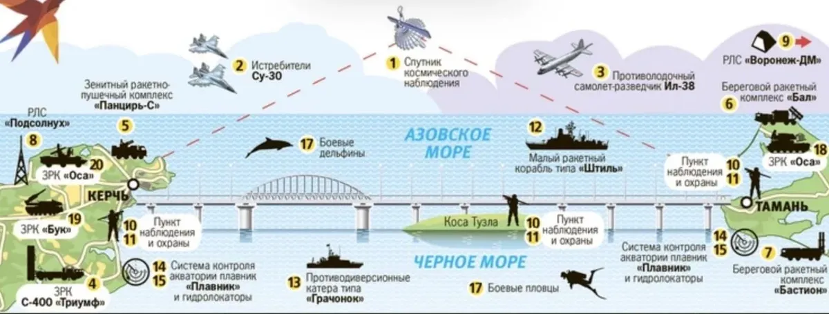 Также из текста следует, что на суше Крымский мост охраняли зенитная ракетная система С-400 «Триумф», предназначенная для противовоздушной обороны от ударов крылатых, аэробаллистических и баллистических ракет тактического и оперативно-тактического назначения, от самолетов армейской, тактической и стратегической авиации. «Триумфу» помогал зенитный ракетно-пушечный комплекс «Панцирь-С1» предназначенный для противовоздушной защиты от самолетов и вертолетов, высокоточных крылатых ракет и управляемых авиабомб, беспилотных аппаратов.