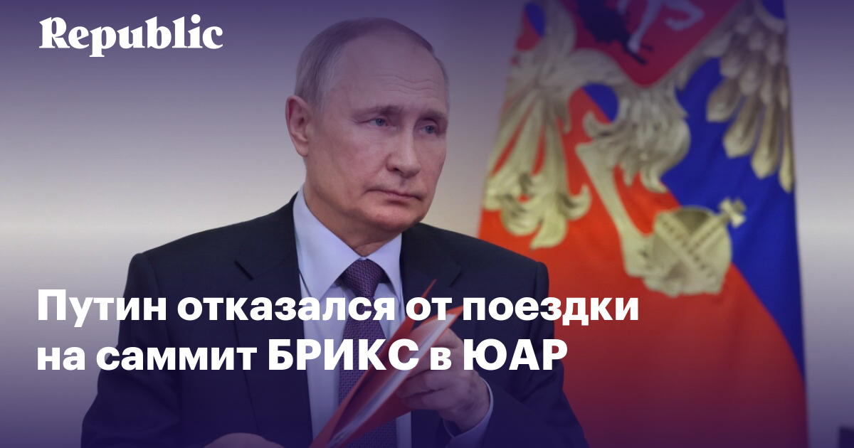 Владимир Путин не поедет на саммит БРИКС в Южно-Африканскую Республику (ЮАР). Об этом сегодня сообщил офис президента ЮАР. «По взаимной договоренности, президент Российской Федерации Владимир Путин не будет присутствовать на саммите, но РФ будет представлять министр иностранных дел Сергей Лавров», — говорится в сообщении. Это подтвердил пресс-секретарь президента РФ Дмитрий Песков.