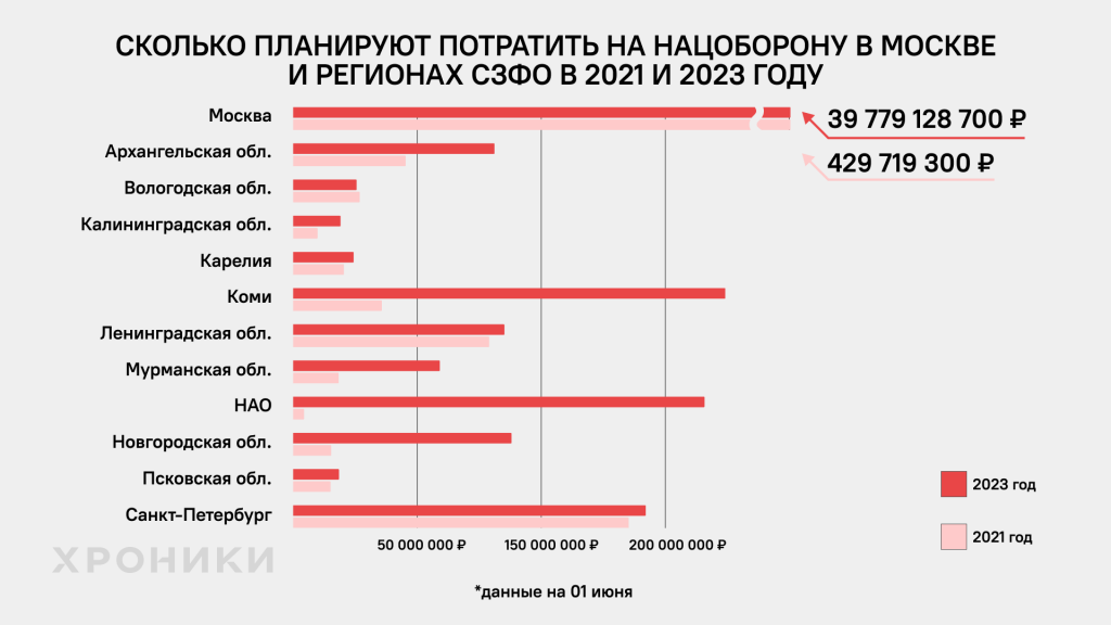 «Хроники. Медиа» изучили расходы на «национальную оборону» по отчетам об исполнении региональных бюджетов СЗФО за первые пять месяцев 2023 года и сравнили эти данные с довоенным 2021 годом, а также с расходами на те же цели в Москве и приграничных с Украиной российских регионах.