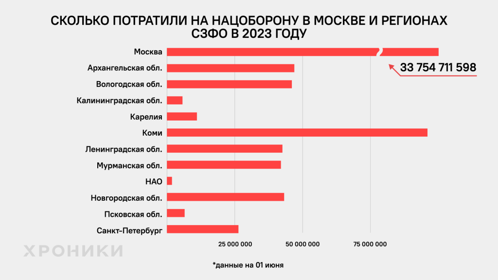 К 1 июня 2023 года регионы СЗФО израсходовали на нацоборону 42% от запланированного. Причем, Вологодская область умудрилась потратить аж 181%, так как местные власти изначально заложили в бюджете на нацоборону 25 млн руб., но к началу лета потратили 46 млн. Бюджет скорректировали с действительностью только в июле 2023 года.