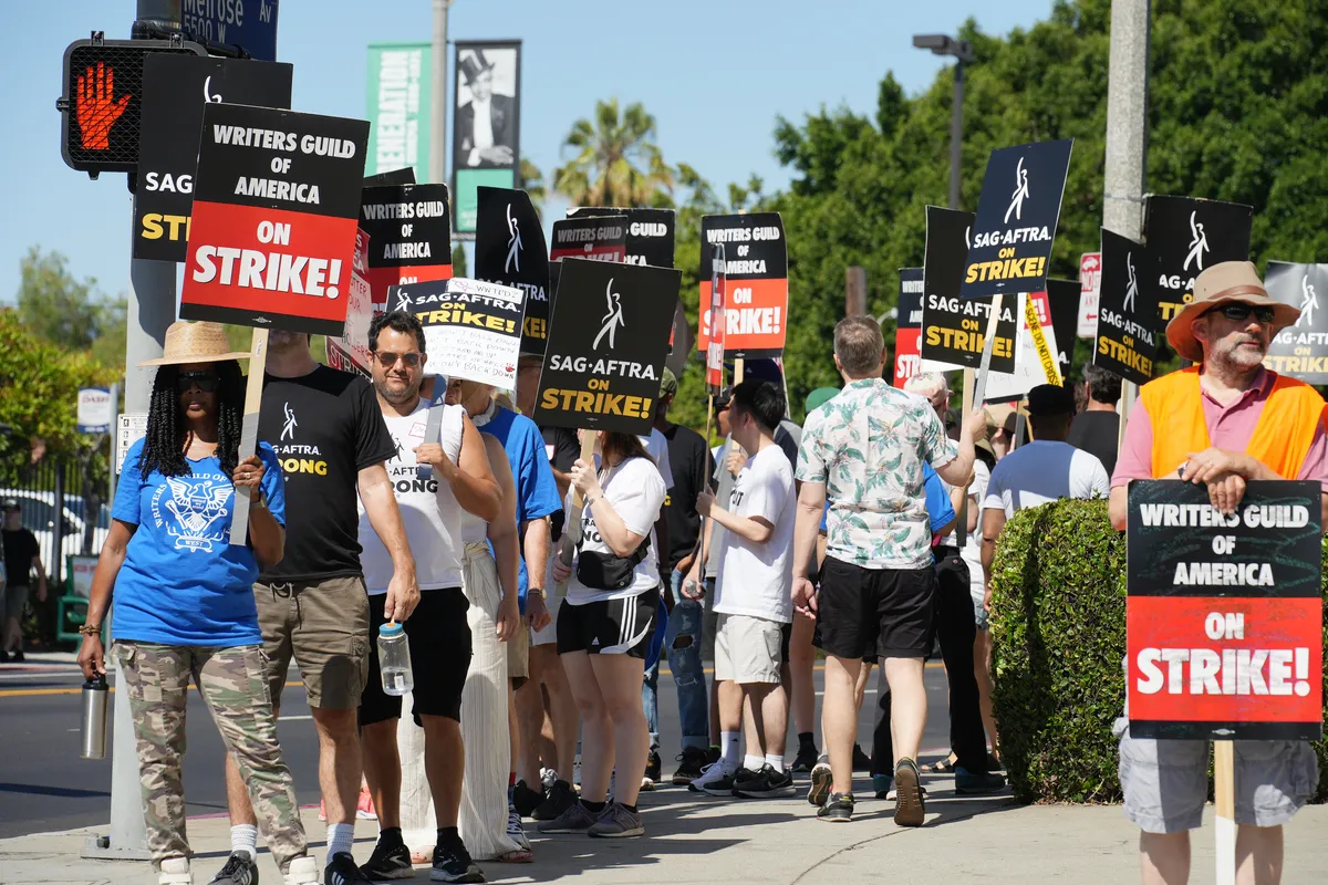 Бастующие члены SAG-AFTRA пикетируют вместе с бастующими работниками WGA возле офиса Netflix 19 июля 2023 года в Лос-Анджелесе, Калифорния. Фото: Mario Tama/Getty Images