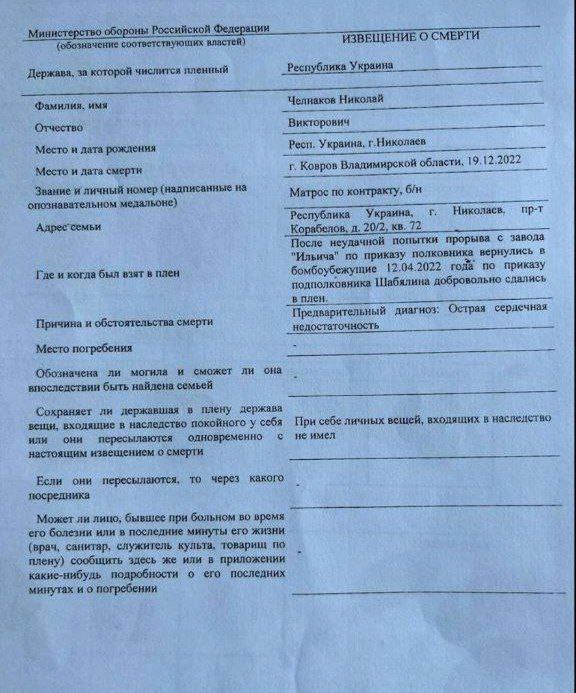 По данным Анатолия Шария, в декабре 2022 года в ИК-7 Владимирской области умер украинский военнослужащий, матрос-контрактник Николай Челнаков, попавший в плен в ходе военного вторжения российской армии. Как следует из извещения о смерти, якобы выданного Минобороны РФ, Челнаков умер якобы от острой сердечной недостаточности. При этом на момент попадания в плен, по словам Шария, матрос был абсолютно здоров.
