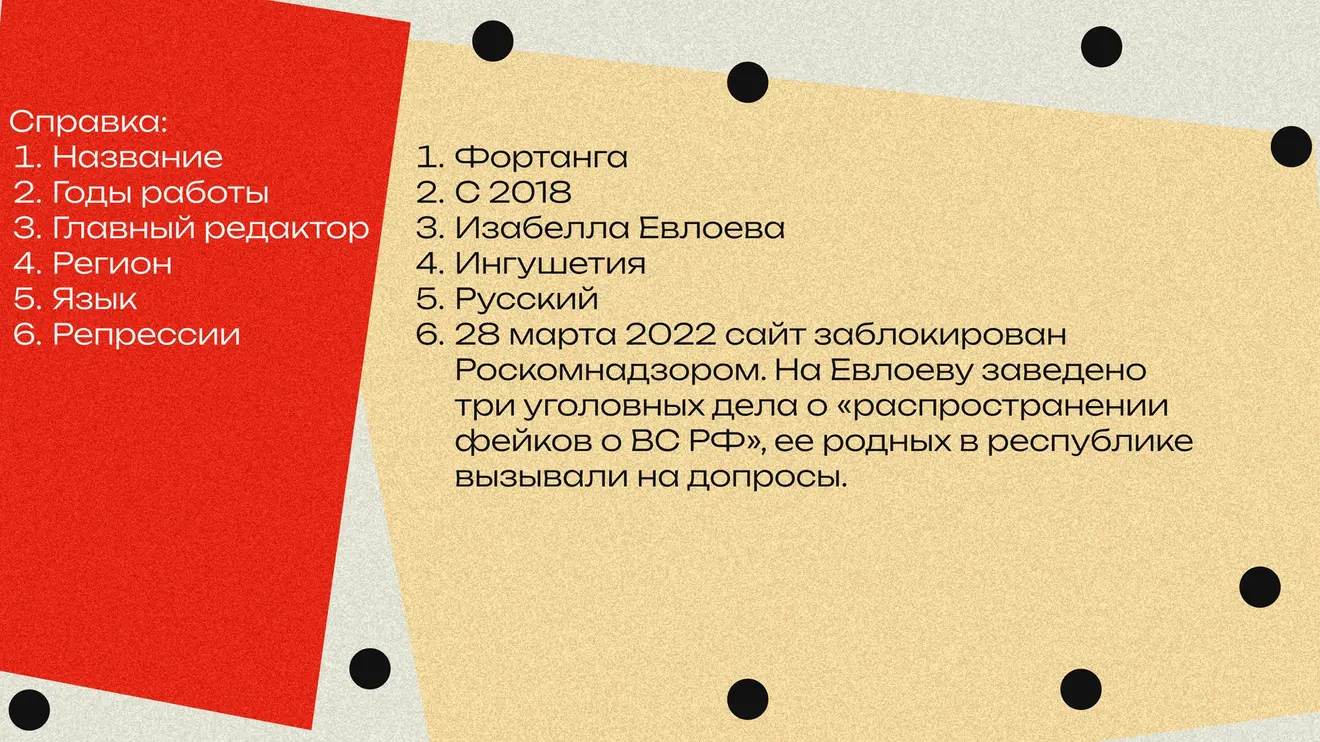 В случае "Фортанги", проекта Изабеллы Евлоевой, отправной точкой для становления СМИ стала репрезентация позиции ингуше_к, особенно оппозиционных активисто_к, по конкретному вопросу. В 2018 году 10% территории Ингушетии были переданы соседней Чечне, что вызвало волну протестов, которые не освещались в государственных СМИ. «Изначально я писала о том, что происходит, в своих соцсетях, — рассказывает Изабелла Евлоева. — Позже решила их переформатировать в площадку для высказывания активистов. Пока шел многотысячный митинг, по телевизору показывали мультики и советские фильмы. А мне хотелось, чтобы голос протестующих был услышан».