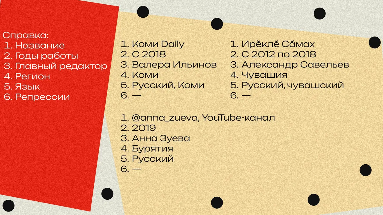 Мы поговорили с основатель_ницами и главными редактор_ками пяти медиа: «Ирĕклĕ Сăмах«Свободное слово» с чувашского.» из Чувашии, «ФортангаРека в Ингушетии и Чечне. В 2018 и 2019 годах житель_ницы Ингушетии протестовали против передачи Чечне земель, находящихся по одну из сторон реки Фортанга.» из Ингушетии, Komi Daily из Республики Коми, авторского YouTube-канала из Бурятии, а также «Кавказского узла», где пишут о Северном Кавказе, Южном федеральном округе и странах Южного Кавказа«Региональный фокус "КАВКАЗСКОГО УЗЛА" позволяет освещать события и процессы в России, Европе и на Ближнем Востоке, когда в центре новостной повестки находятся выходцы из регионов, к которым приковано наше внимание - Абхазия, Аджария, Адыгея, Азербайджан, Армения, Астраханская и Волгоградская областях, Грузия, Дагестан, Ингушетия, Кабардино-Балкария, Калмыкия, Карачаево-Черкесия, Краснодарский край, Нагорный Карабах, Ростовская область, Северная Осетия - Алания, Ставропольский край, Чечня и Южная Осетия»..