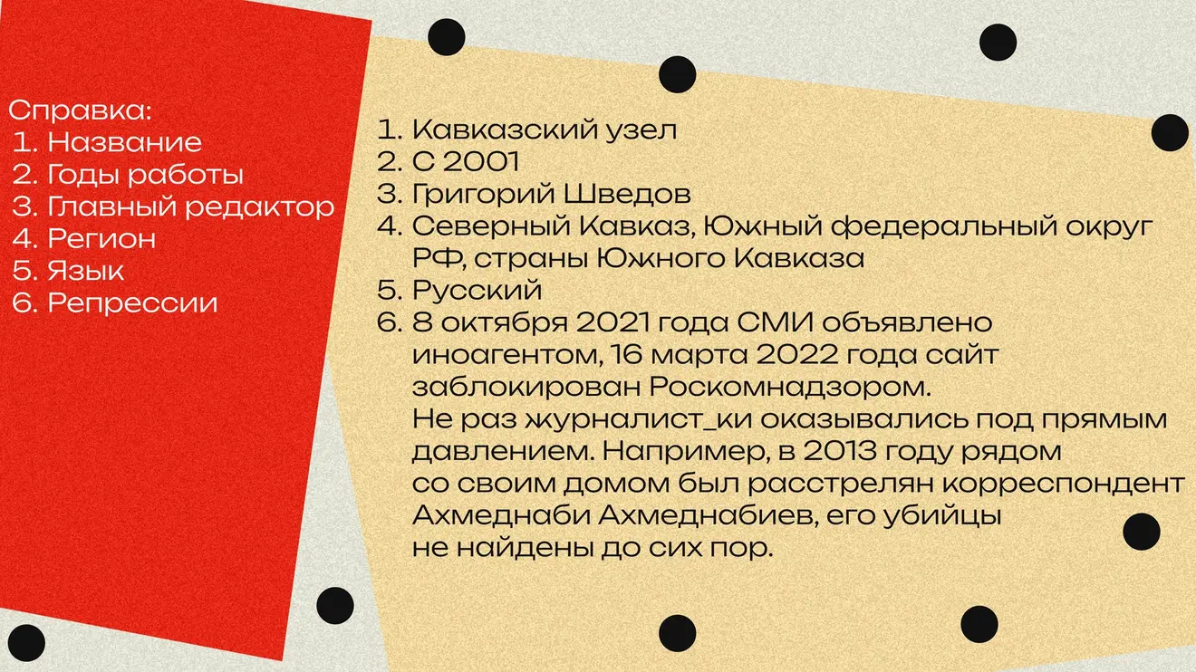 Например, "Кавказский узел" многократно подвергался государственным репрессиям. «За более чем двадцать лет работы мы не раз подвергались атакам со стороны государства, — рассказывает Григорий Шведов. — Но достаточно быстро приняли решение не рассказывать об этом нашей аудитории. Все-таки это лишь наши проблемы. В истории “Кавказского узла" было много случаев, когда на нас подавали в суд. Как правило, с требованием компенсации и опровержения того, что мы писали. Дело в том, что наш принцип — не удалять никакой материал под давлением извне. Если в публикации допущена ошибка, то мы выпускаем дополнение или опровержение. Конечно, суд не единственный метод давления. На наших коллег были покушения, двое журналистов убиты, один отсидел в тюрьме по сфабрикованному делу. В этом ряду DDOS-атаки на наши ресурсы даже упоминать смешно». История «Кавказского узла» — пример того, как нелегко дается «непредвзятость» и сохранение журналистских принципов.