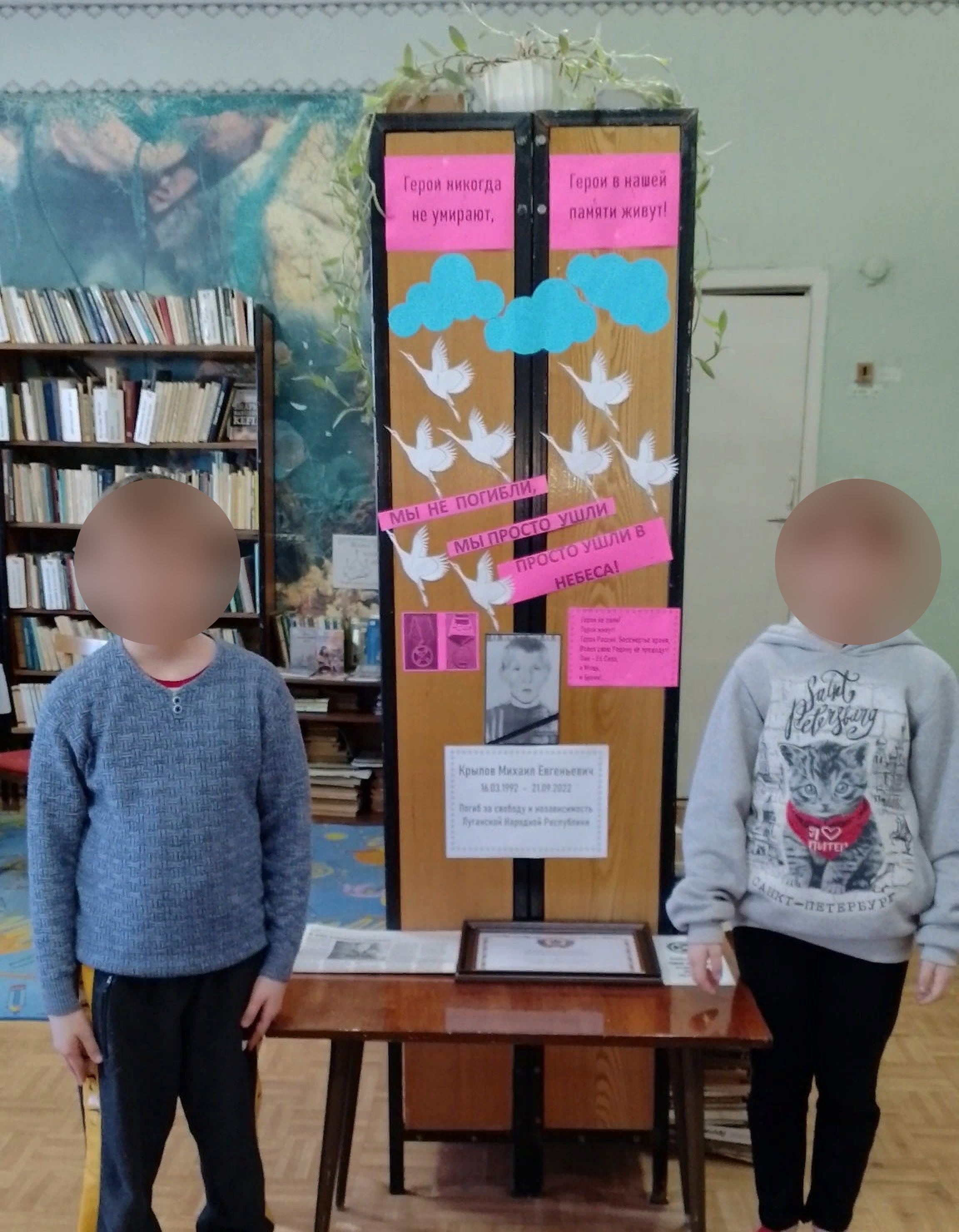 На фотографии, которую выложила администрация библиотеки, запечатлены дети дошкольного возраста: они стоят на фоне книжного шкафа, к которому прикреплен детский портрет погибшего с черной лентой и аппликация с журавлями.