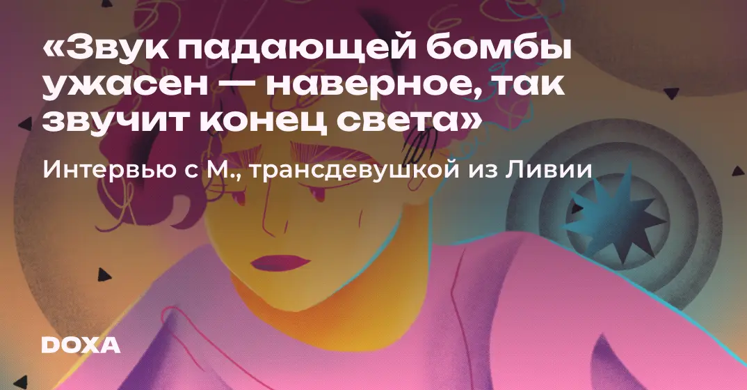 В 2010 году началась Арабская весна, революции загорелись во многих странах Африки и Ближнего Востока. СМИ активно писали об очередном свержении диктатора, но не для всех государств весна закончилась счастливо. О политической ситуации в Ливии редко пишут, хотя именно ее бывший лидер Муаммар Каддафи стал символом многочисленных скандалов и мемов, а также одним из вдохновителей комедии «Диктатор» (2012). Сейчас Ливия — failed state, чьи западные земли контролирует правительство во главе с Мухаммадом аль-Манфи, а восток — армейский генерал Абдель Раззак ан-Назури. В атмосфере постоянной национальной катастрофы росла трансгендерная девушка М., она в детстве научилась держать автомат, прятаться от бомб НАТО и никому не рассказывать о маленьких ночных секретах. Я поговорила с беженкой о жизни в «коммунистической» стране, повседневном насилии и осознании гендерной идентичности.