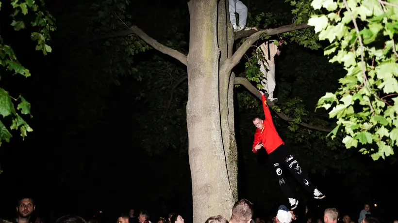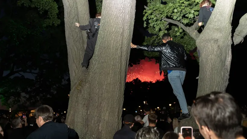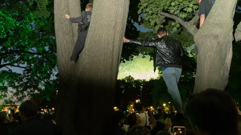 Прохожу по Гороховой до президентской библиотеки и «Медного всадника». Некоторые люди забираются на скамейки, залазят на деревья. На ветвях помещается до пяти человек, но не все из них потом могут беспроблемно слезть. Трое мужчин забрались без обуви, оставив кроссовки и рюкзаки с бутылками внизу, у корней. Люди внизу переговариваются: «Ты как туда залез?» — на что с дерева долетает ответ: «Да вот! Мне бы телефон спустить, а то он разряжен».