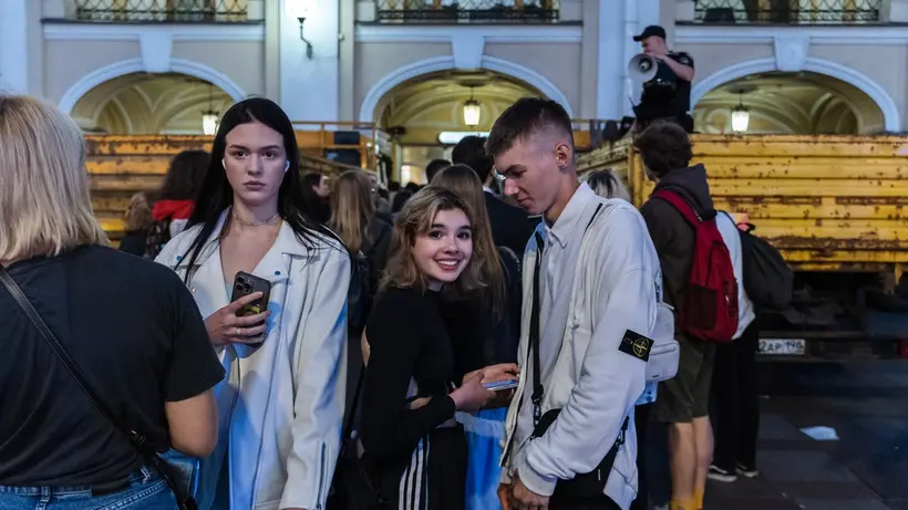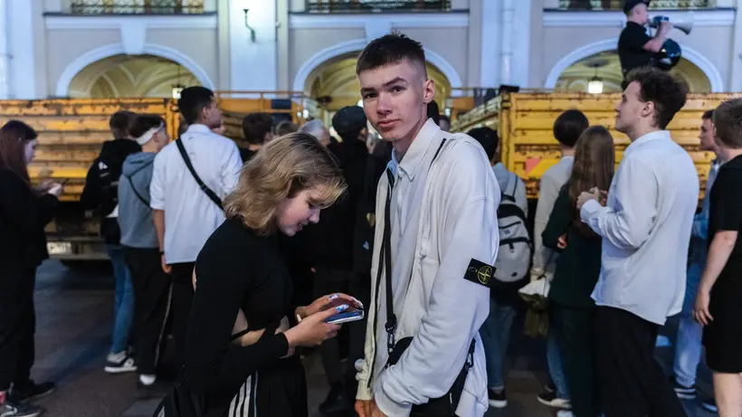«Братанчик, идем, ебать там бал будет! Девчонки, пишите нам, пожалуйста», — кричит парень лет 19 своим друзьям на эскалаторе. Мы поднимаемся на станции «Гостиный двор», от нее до Дворцовой площади идти минут пятнадцать. У эскалатора стоят пять полицейских, а у выхода из метро — их машина, она здесь регулярно с 24 февраля прошлого года.