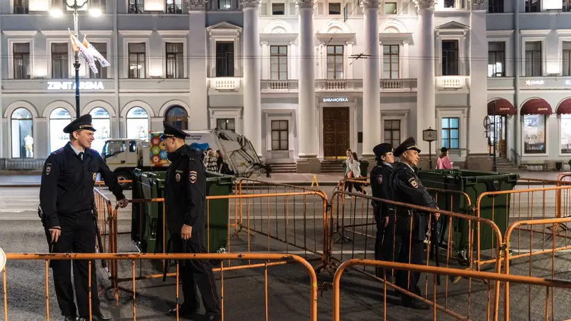 Прямо к набережной и памятнику «Медному всаднику» пройти нельзя из-за ограждений. Некоторые люди пытаются договориться с полицейскими и волонтер_ками, чтобы подойти поближе. «У нас постановление, никак не можем пустить. У вас билет есть? Вы выйти можете где угодно, а зайти — только там, где заходили». Из-за ограждений многие остаются в парке у здания Адмиралтейства и на детской площадке рядом.