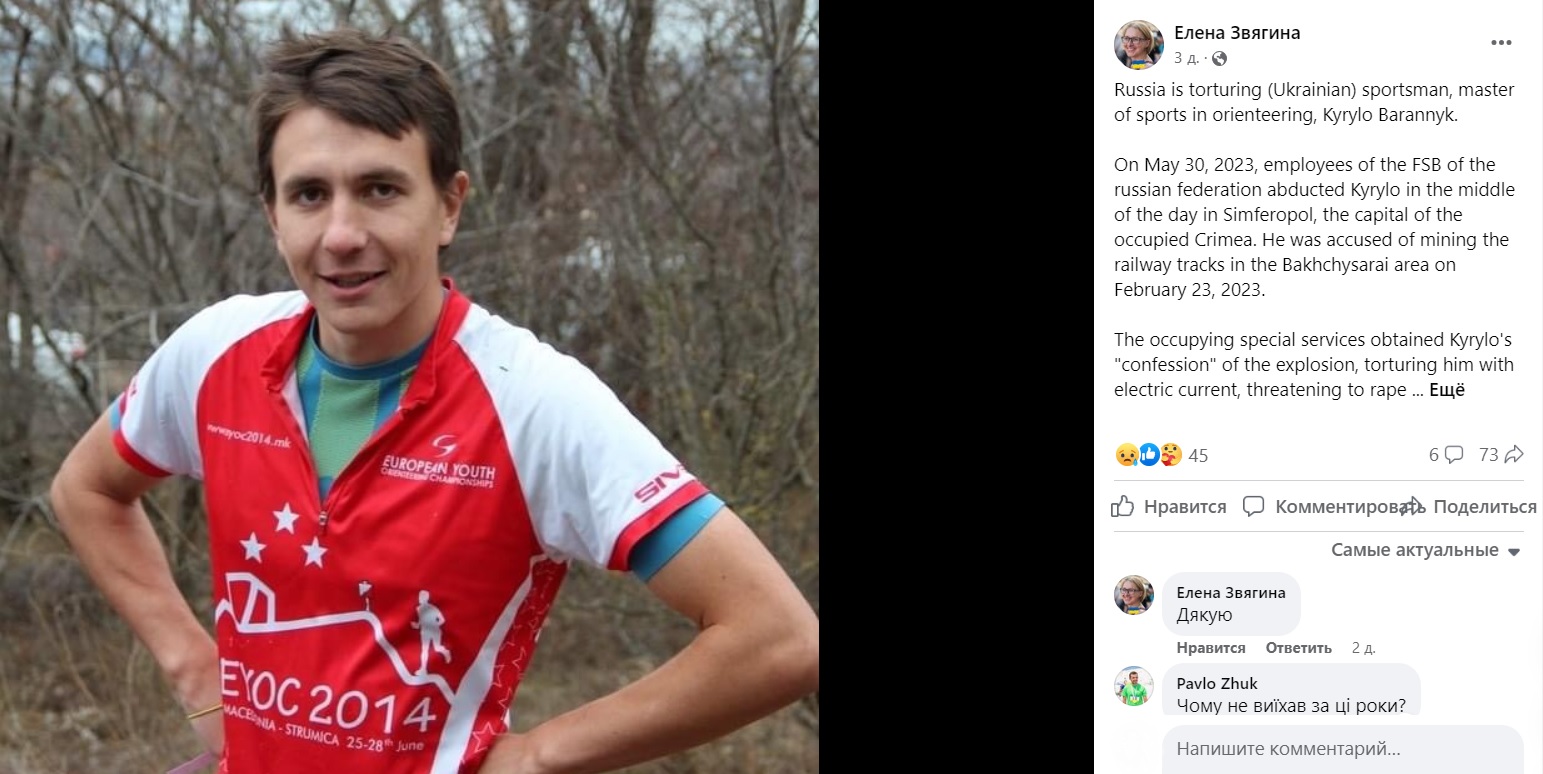 «Оккупантские спецслужбы добились «признания» Кирилла во взрыве, пытая его электрическим током, угрожая изнасиловать и убить его мать. В настоящее время Кирилл Баранник находится в камерах следственного изолятора родного оккупированного города, подвергается пыткам. Требуем прекратить пытки и освободить Кирилла Баранника. Пытки – это международное преступление. Лица, причастные к этому, будут привлечены к ответственности. Кирилл Баранник стал очередной жертвой репрессивной машины России, которая после каждой «минировки» на оккупированном полуострове организует «охоту на ведьм». Россия мучает украинского спортсмена», – говорится в заявлении.