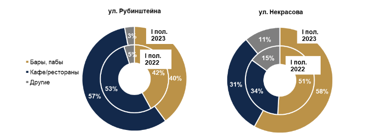 В первом полугодии прошлого года Рубинштейна также уступала Некрасова по доле баров и пабов: тогда этот показатель на двух улицах составлял 42 % и 51 % соответственно.