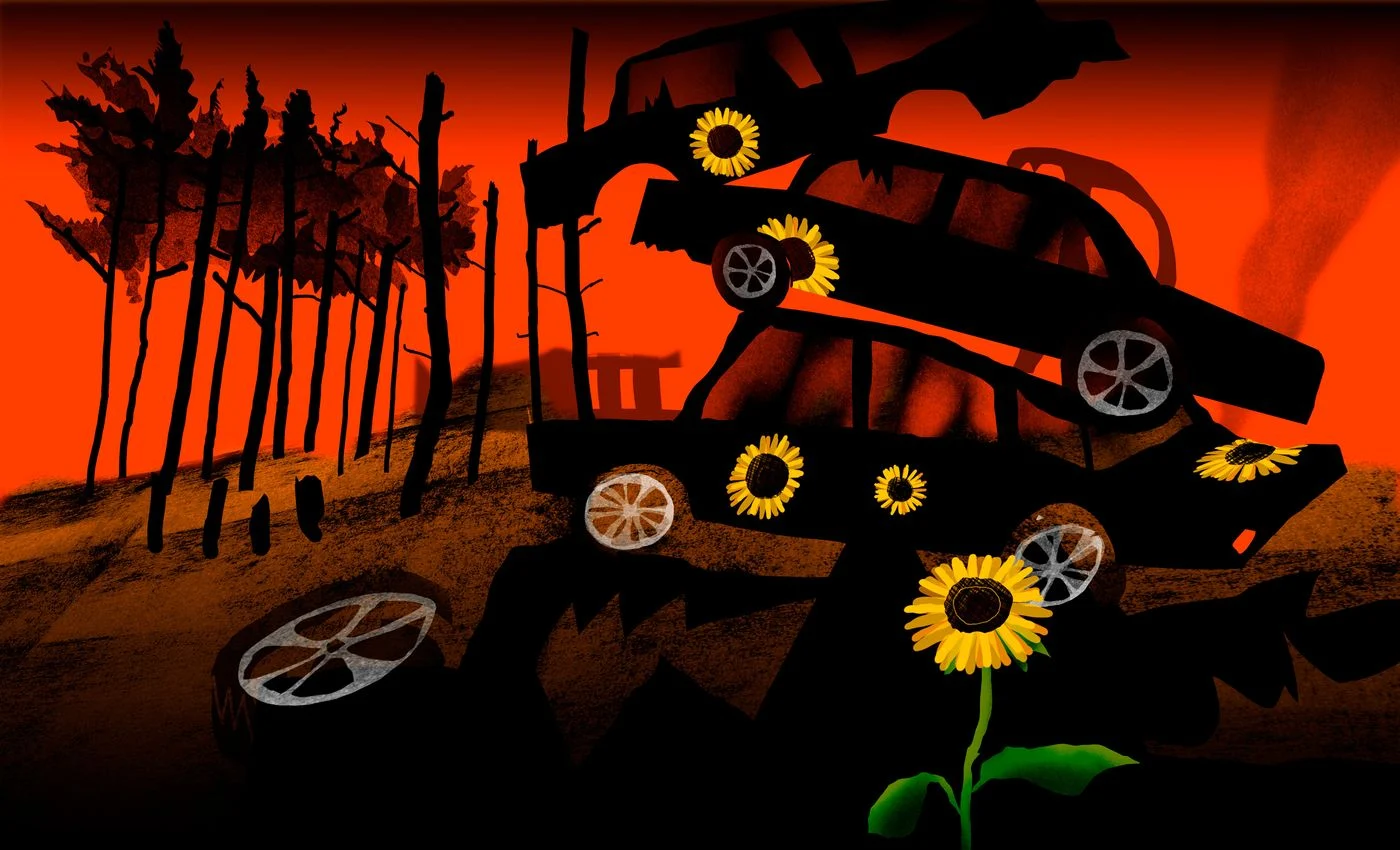 По всему Ирпеню черные цветы — следы от обстрелов на домах. Наспех засыпанные воронки от снарядов, заколоченные здания под снос, просевший мост через реку. На автомобильной свалке на окраине города среди штабелей ржавеющих обгоревших машин — проблески яркого желтого цвета. Кто-то рисует подсолнухи.