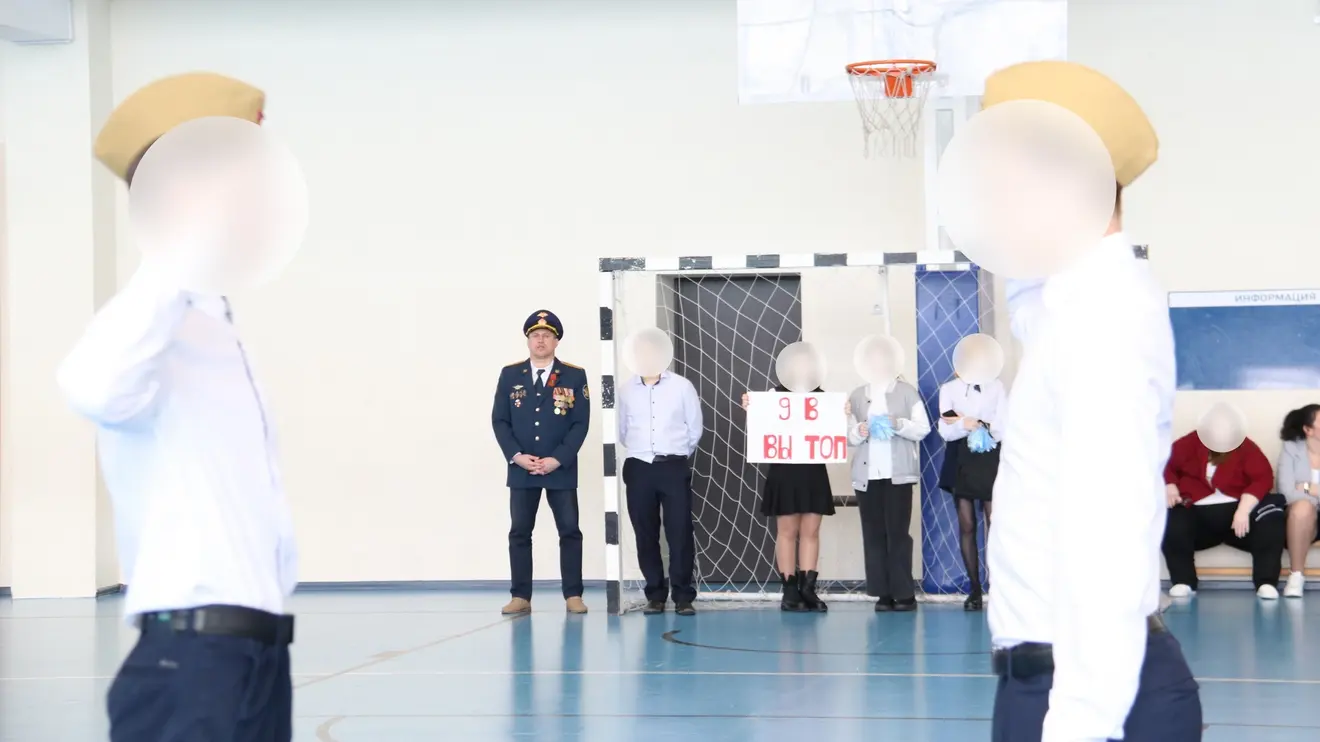 Детей распределили в несколько команд: «Ледовое побоище», «Ополченцы», «Потомки Петра», «Герои 1812 года», «Пионеры — герои», «Время героев». Школьники, которые оказались в последней команде, в учебное время готовили выступление и доклад о российских военных в Украине. Тексты докладов вывесили в актовом зале. Одна из учительниц этой школы объяснила в интервью DOXA, что из-за особенностей детей со слухом провоенные лозунги в школе передавали по громкоговорителям. «Мы владеем многими природными ресурсами, о которых мечтают другие государства. Мы бережем свою страну, поэтому её рубежи защищает российская армия и флот. Они — надежная опора нашего государства», — произносит громкий диктор голос диктора на видео, которое Марина* отправила нам.