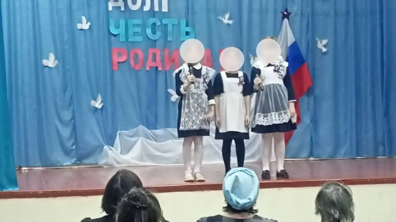 Сценарий такого патриотического концерта (со сценками и стихами про Донбасс) мы нашли на онлайн-портале для родителей. По задумке авторов, в конце дети должны исполнить танец «Россия» и поднять флаг. Но в школе села Стемасс концерт завершился обращением школьни_ц к российским военным: «Поздравляем! Ждём вас с Победой!»