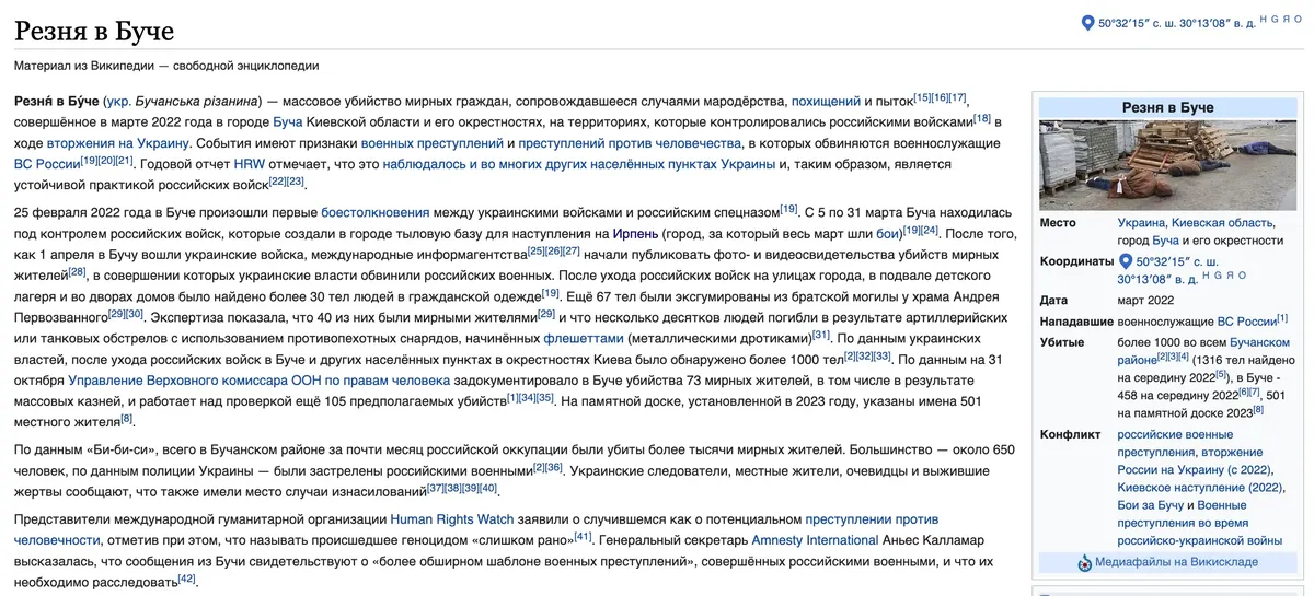 — Можно я процитирую «Википедию»? Я открыла страницу про Бучу, и тут написано: «В 2022 году во время вторжения России на Украину в Бучу вошли российские войска, и на территории города велись бои. После освобождения от российских войск в городе обнаружены факты массового убийства. Министерство обороны РФ отрицает причастность, прибегая к пропаганде дезинформации и не заслуживающим доверия аргументам». Уж не знаю, насколько это нейтрально звучит.