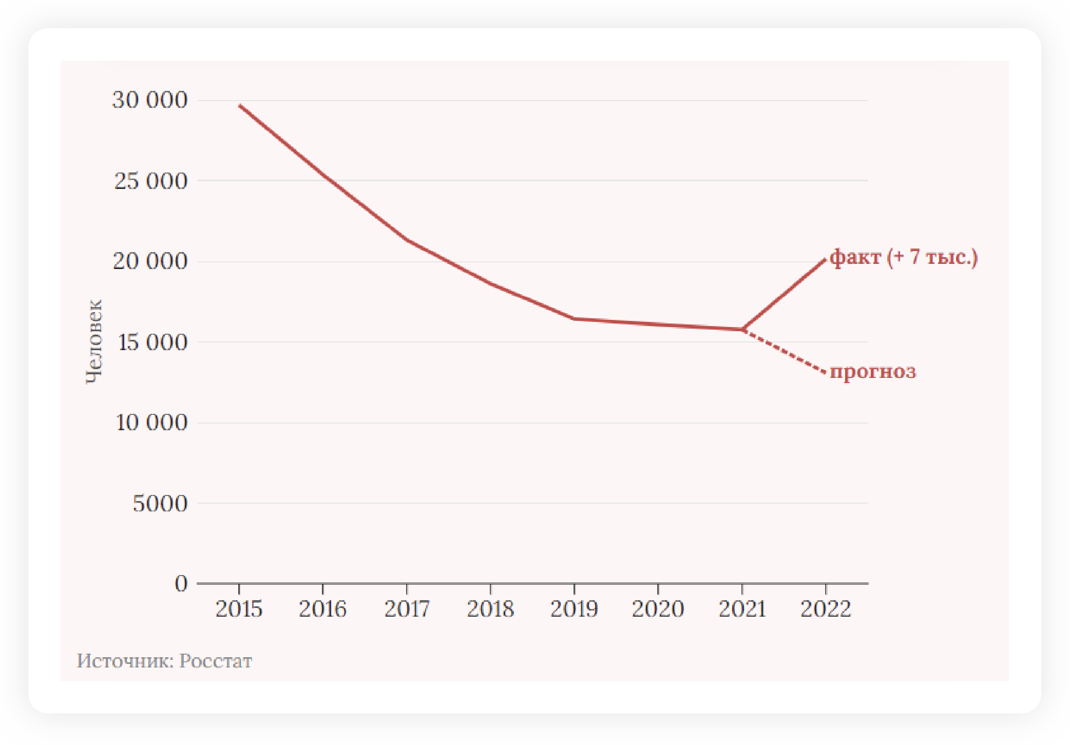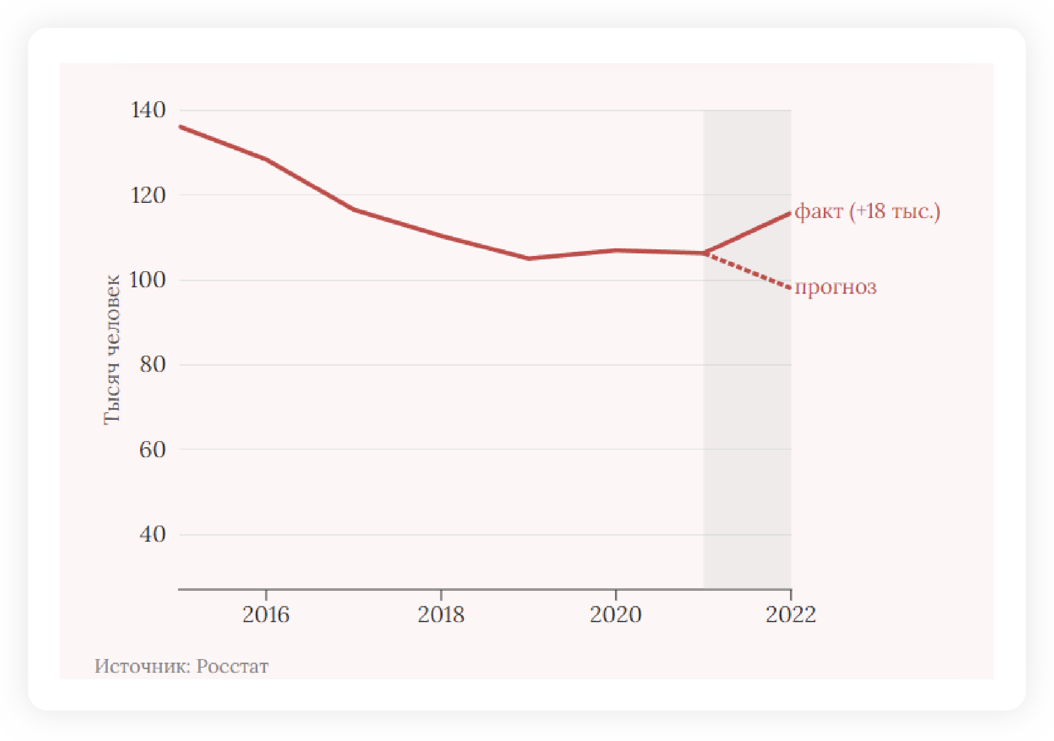 По прогнозам, мужская смертность от внешних причин в 2022 году должна была снизиться и составить 98 тысяч. По факту же она составила 116 тысяч человек. Рост избыточной смертности на 18 тысяч человек можно объяснить вмешательством в статистику войны.