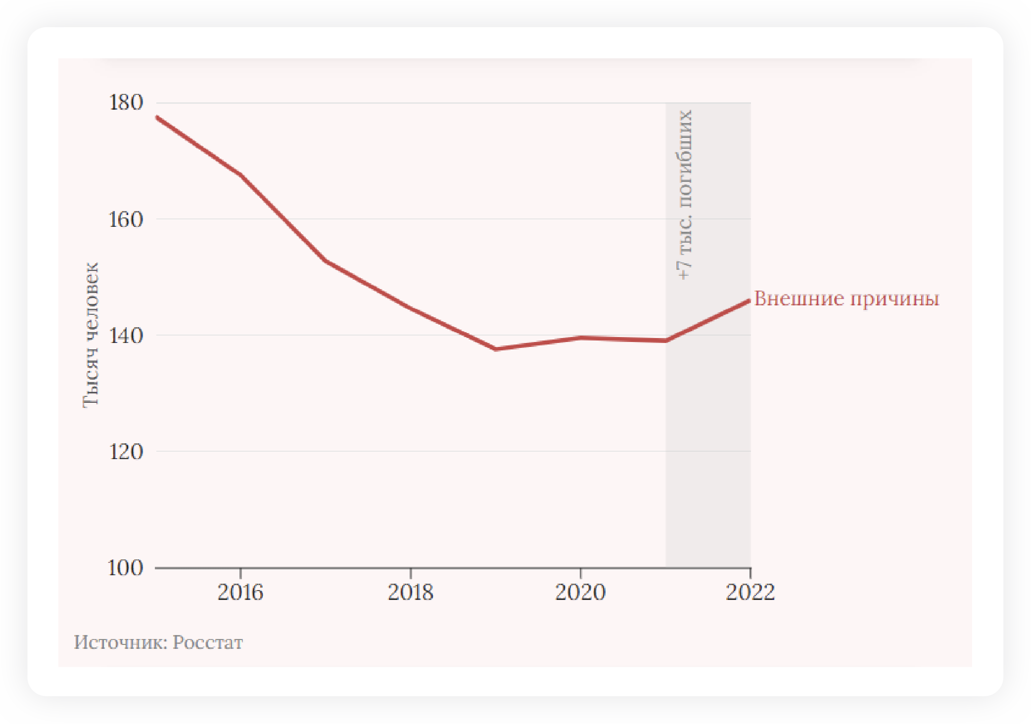 На фоне войны наблюдается рост смертей от внешних причин, то есть таких воздействий, как ДТП, убийства, самоубийства, ожоги и другие. Именно в эту категорию по логике должны попадать погибшие на войне.