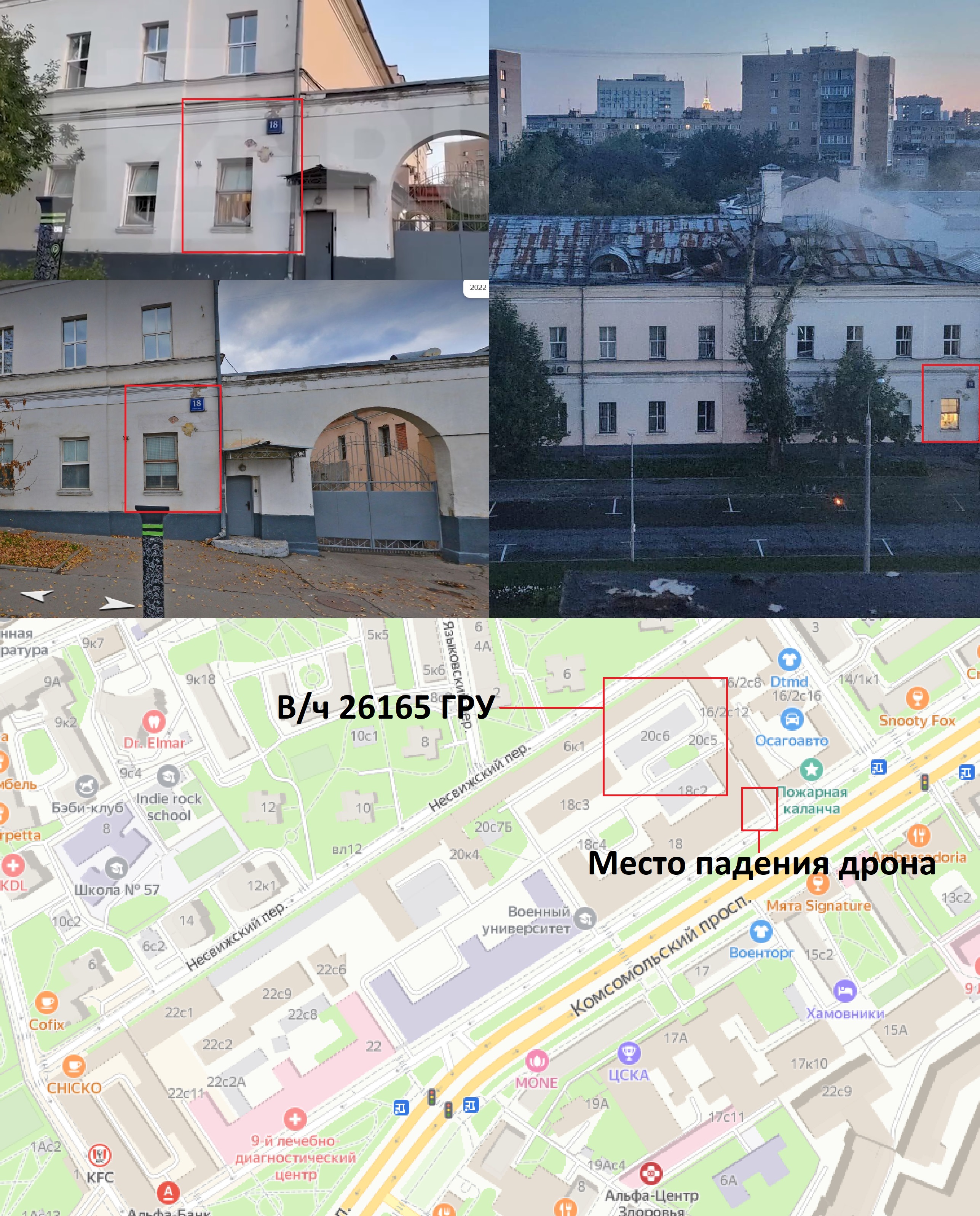 Как следует из сообщений в российских телеграм-каналах и фотографий, беспилотник пробил крышу здания по адресу: Комсомольский проспект, дом 18. Это часть комплекса зданий Минобороны, расположенного на территории бывших Хамовнических казарм.