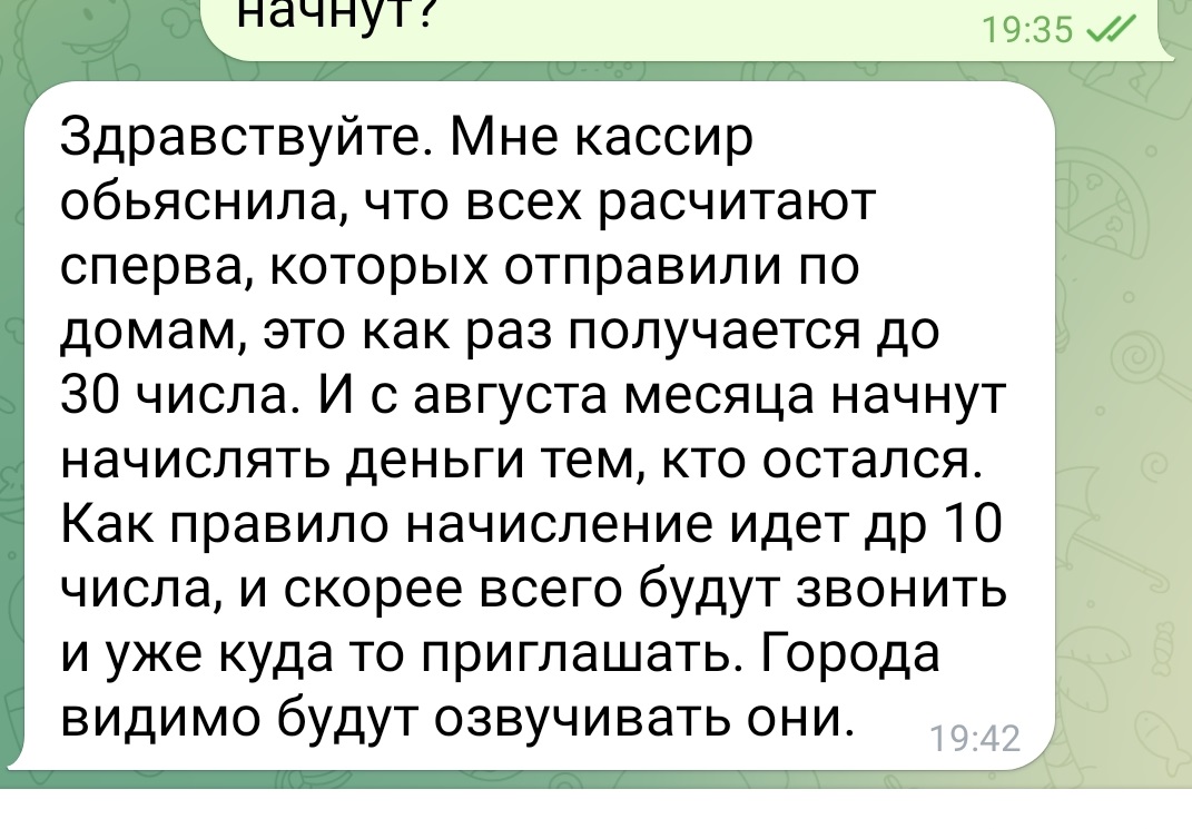 "Здравствуйте. Мне кассир объяснила, что сперва рассчитают всех, которых отправили по домам, это как раз получается до 30 числа. И с августа месяца начнут начислять деньги тем, кто остался. Как правило, начисление идет до 10 числа, и, скорее всего, будут звонить и уже куда-то приглашать. Города, видимо, будут озвучивать они", – пишет участница ЧВК-чата Екатерина.