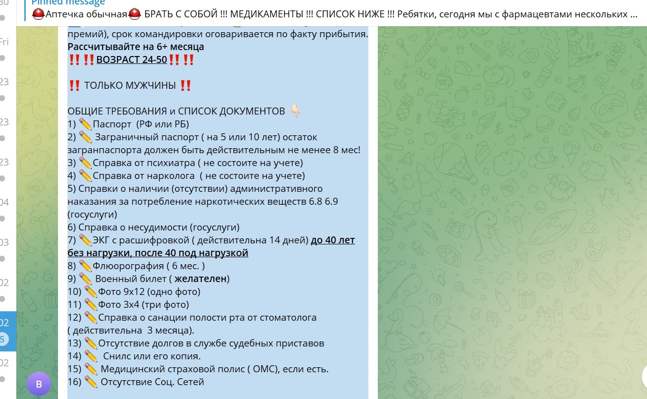 "Ежемесячное вознаграждение 💰240 тыс. (без учета премий), срок командировки оговаривается по факту прибытия. Рассчитывайте на 6+ месяца ‼️‼️ВОЗРАСТ 24-50‼️‼️ ‼️ ТОЛЬКО МУЖЧИНЫ ‼️ ОБЩИЕ ТРЕБОВАНИЯ и СПИСОК ДОКУМЕНТОВ 👇🏻 1) ✏️Паспорт (РФ или РБ) 2) ✏️ Заграничный паспорт ( на 5 или 10 лет) остаток загранпаспорта должен быть действительным не менее 8 мес! 3) ✏️Справка от психиатра ( не состоите на учете) 4) ✏️Справка от нарколога ( не состоите на учете) 5) Справки о наличии (отсутствии) административного наказания за потребление наркотических веществ 6.8 6.9 (госуслуги) 6) Справка о несудимости (госуслуги) 7) ✏️ЭКГ с расшифровкой ( действительна 14 дней) до 40 лет без нагрузки, после 40 под нагрузкой 8) ✏️Флюорография ( 6 мес. ) 9) ✏️ Военный билет ( желателен) 10) ✏️Фото 9х12 (одно фото) 11) ✏️Фото 3х4 (три фото) 12) ✏️Справка о санации полости рта от стоматолога (действительна 3 месяца). 13) ✏️Отсутствие долгов в службе судебных приставов 14) ✏️ Снилс или его копия. 15) ✏️ Медицинский страховой полис (ОМС), если есть. 16) ✏️ Отсутствие Соц. Сетей ‼️Для лиц с избытком веса необходимы доп. Справки📝: 🔬Анализ крови на сахар (Срок не более 2 недель) 🔬ЭКГпод нагрузкой с расшифровкой (действительна 14 дней) ‼️‼️ОГРАНИЧЕНИЯ и ТРЕБОВАНИЯ‼️‼️ 1) Лица болеющие тяжелыми заболеваниями препятствующими выполнению задач, наркомания ⚠️Переболевшие 🦠Гепатитом В,С , если прошел лечение, то с собой иметь 🔖ПЦР тест количественный и качественный – сдавать только в "Ситилаб", "Гемотест", "Инвитро". Срок действия 14 дней , так же🔖 заключение врача инфекциониста🦠, что не болен и не опасен. 2) Вам должно быть от 24 до 50 лет 🔐на текущий момент. ❗️ Старше 50 лет рассматриваются специалисты(не гражданский специальностей) востребованные для компании с хорошим здоровьем в индивидуальном порядке. 3)Судимости за распространение наркотиков, бандитизм, терроризм, все что связано с сексуальной неприкосновенностью – отказ. Остальные судимости обговариваются по факту прохождения собеседования. По прибытию на базу тебя ждет: ✅Анализ (экспресс) крови ✅Анализ мочи на наркотики ✅Собеседование ✅Получение вещевого имущества и снаряжения по сезону. Подготовка по военным специальностям. 🚊✈️Готов приехать в Краснодар в ближайшее время для трудоустройства?! Что с собой брать: 1)Для душа все необходимое 2) Медикаменты и аптечка желательны 3)Личные вещи первой необходимости 4)Билеты сохраняй (проезд компенсируется) 5)Данные паспорта доверенного лица, если нужно что бы ЗП за тебя получали. Как получать доведут на базе, родные без💰 ЗП не останутся. 💳💰ПЕРЕВОДОВ НА КАРТУ💳 НЕТ И НЕ БУДЕТ, ТОЛЬКО НАЛИЧНЫЕ💵💴💶 . КУДА И К КОМУ ЕХАТЬ???⁉️ ➡️Краснодарский край, х. Молькино. На первом КПП спросить💬 как пройти в Пионерский лагерь. На воротах, у казарм сказать что на работу от 〽️Моргана.🏁 ‼️Внимание требования компании‼️До выезда к нам на базу, вам необходимо удалиться со всех социальных сетей, и уже к нам для трудоустройства прибываете с обычным кнопочным телефоном без камеры 👉(смартфоны📱, камеры гоу-про🎥, ноутбуки💻 – брать с собой на работу не нужно и не надо)👈в случае прибытия с выше изложенным все будет утилизировано