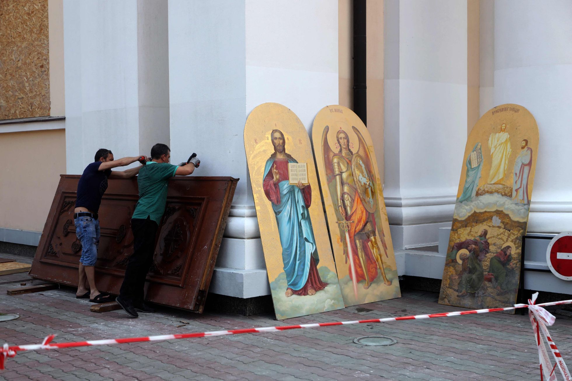 Oleksandr Gimanov / AFP / Scanpix / LETA Workers at the Transfiguration Cathedral with a decoration that survived Russia’s July 24 attack
