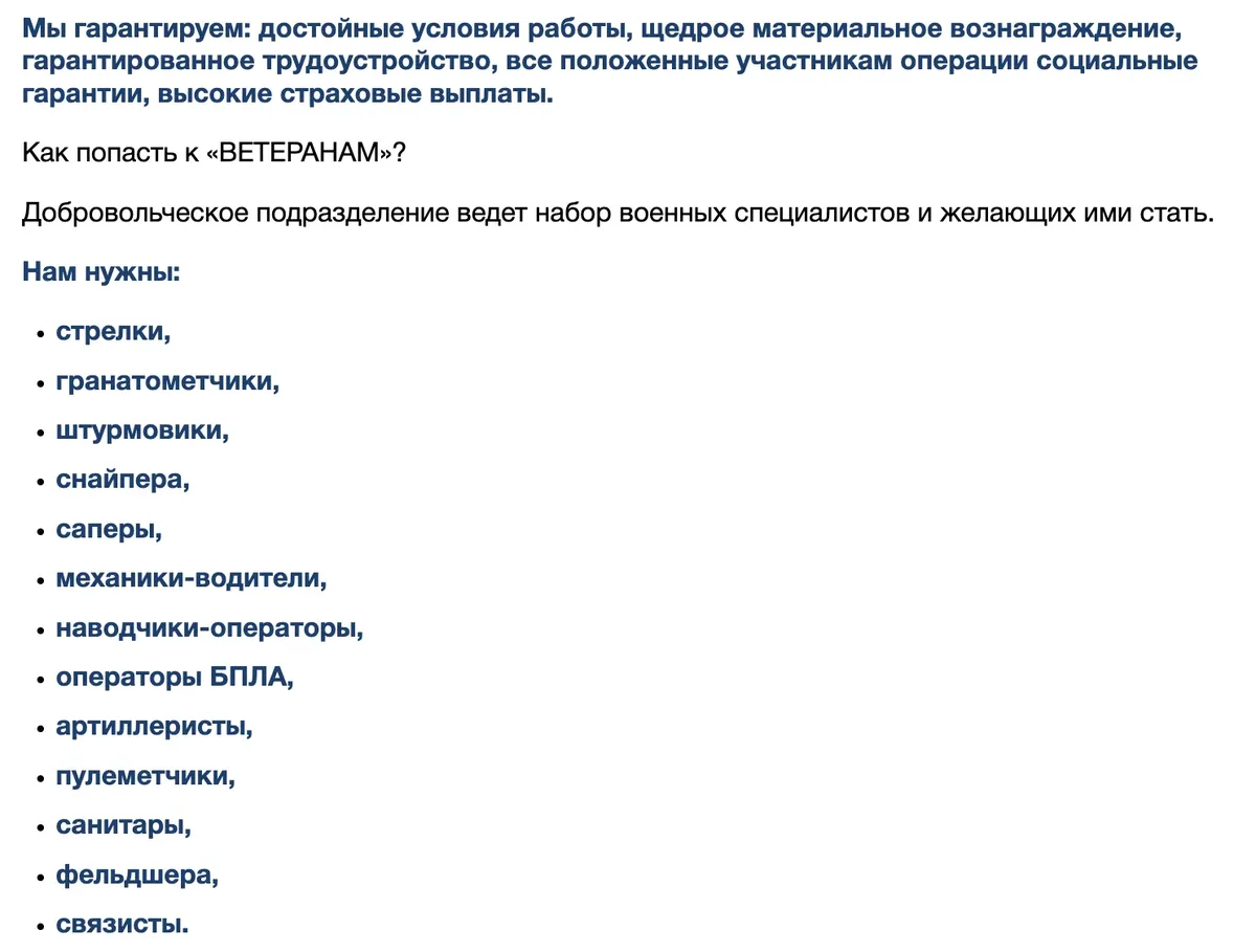 «Большой, дружный, профессиональный коллектив ждет Вас уже сегодня. Нам нужны: стрелки, гранатометчики, штурмовики, снайпера, саперы, механики-водители, наводчики-операторы, операторы БПЛА, артиллеристы, пулеметчики, санитары, фельдшера, связисты. Основная и приоритетная задача — участие в специальной военной операции по денацификации и демилитаризации Украины. Мы ведем постоянный набор людей. Работа найдется для каждого. Если Вы не служили в армии и у вас нет военной специальности — не проблема. Обучим, подготовим, натаскаем».