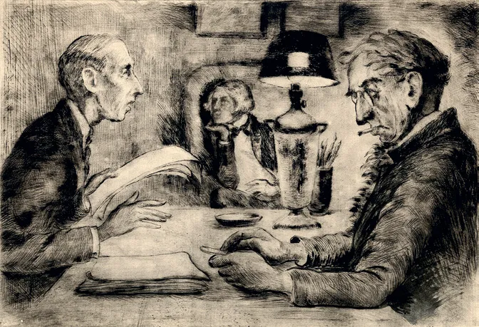 Татьяна Маврина. Автопортрет. 1930-е годы. ГМИИ им. А. С. Пушкина Наконец, Елизавета Кругликова изображает, как она слушает разговор молодого поэта и антиковеда Сергея Шервинского и мэтра Михаила Кузмина — в зеркалах их заветных дум, при этом задумавшись о своем со всей решительностью, только так она могла сберечь себя. «Сама художница, во фраке и галстуке-бабочке, лукаво спряталась в дальнем кресле. Она и Кузмин — равновесные фигуры уходящего, но не ушедшего Серебряного века — слушают чтение Шервинского, разложившего на столе рукопись. Всю сцену, как дым времени, окутала живописная светотень. Главное в ней — свободный творческий диалог, без труда преодолевающий и границы возраста, и границы гендера, и политические границы» (с. 258).