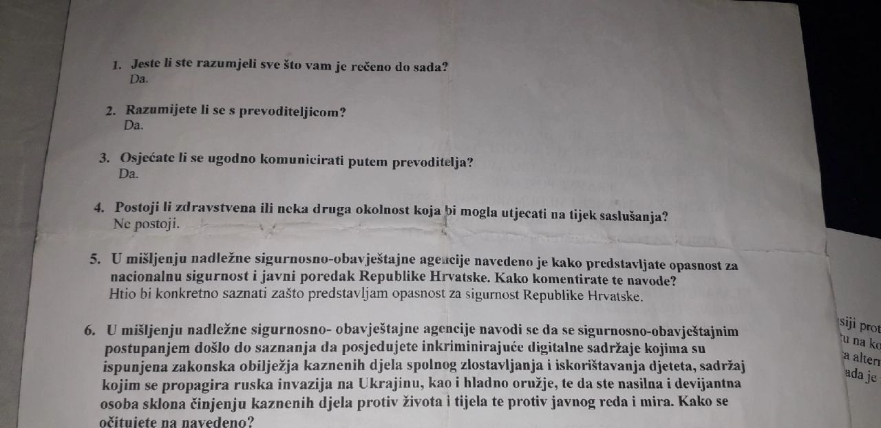 «По мнению компетентного органа безопасности и разведки, вы угрожаете национальной безопасности Республики Хорватия. Вы обладаете инкриминирующим цифровым контентом, который соответствует юридическим признакам преступных действий сексуального насилия и эксплуатации ребенка, контентом, который пропагандирует российское вторжение в Украину, а также имеете холодное оружие. Вы – жестокий и девиантный человек, склонный к совершению преступлений против жизни и здоровья, против общественного порядка и мира»,