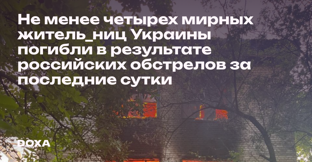 Не менее четырех мирных житель_ниц Украины погибли из-за российских обстрелов за последние сутки, еще как минимум семь человек пострадали, сообщают администрации украинских регионов. Обстрелам подверглись Донецкая, Херсонская, Запорожская, Харьковская и Сумская области.