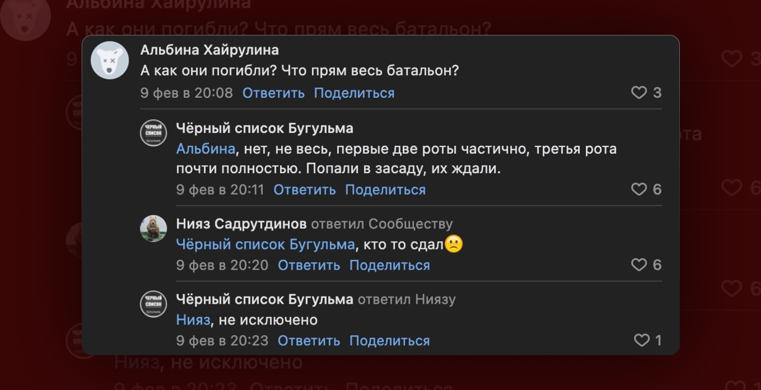 – Нет, не весь. Первые две роты частично, третья рота почти полностью. Попали в засаду, их ждали, – отвечает ей администратор группы "Черный список Бугульма".