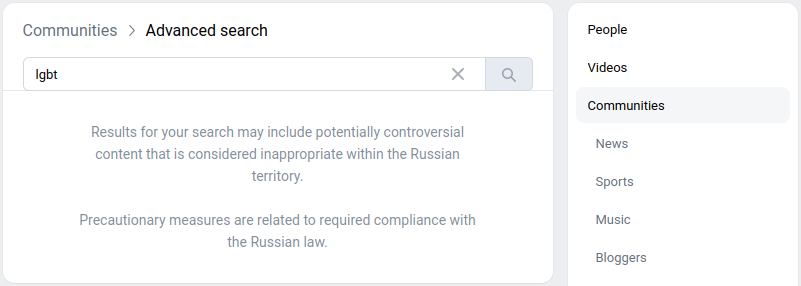 Например, при поиске сообществ и людей ВК отключает результаты поиска, если запрос содержит определенные ключевые слова, связанные с ЛГБТКИ+ тематикой: «гей», «лесбиянка», «фембой» и т. д. ВК также напрямую блокирует отдельные сообщества и личные аккаунты.