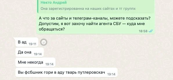 — В ад. Да она. Мне некогда. Вы фсбшник гори в аду тварь путлеровкач, — написал Андрей и перестал отвечать на сообщения.