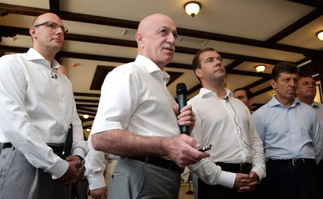Таймураз Боллоев (второй слева) и Дмитрий Медведев во время посещения горнолыжного курорта «Роза Хутор». Фото: Президент России