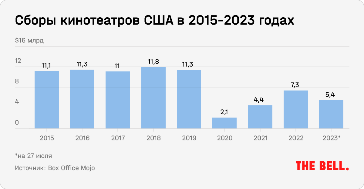 Некоторые сети, включая второго по величине оператора кинотеатров в мире почти с 9,2 тысячи экранов на 751 площадке в 10 странах Cineworld, прошли процедуру банкротства. До пандемии кинопрокат в США приносил стабильную выручку в районе $11 млрд ежегодно, но рынок далек от восстановления до сих пор. Ссылаясь на данные Boxoffice Pro, агентство Bloomberg Intelligence понизило прогноз по выручке кинотеатров в этом году на 2%, примерно до $8,9 млрд. Причина — неопределенность из-за протестов в Голливуде.