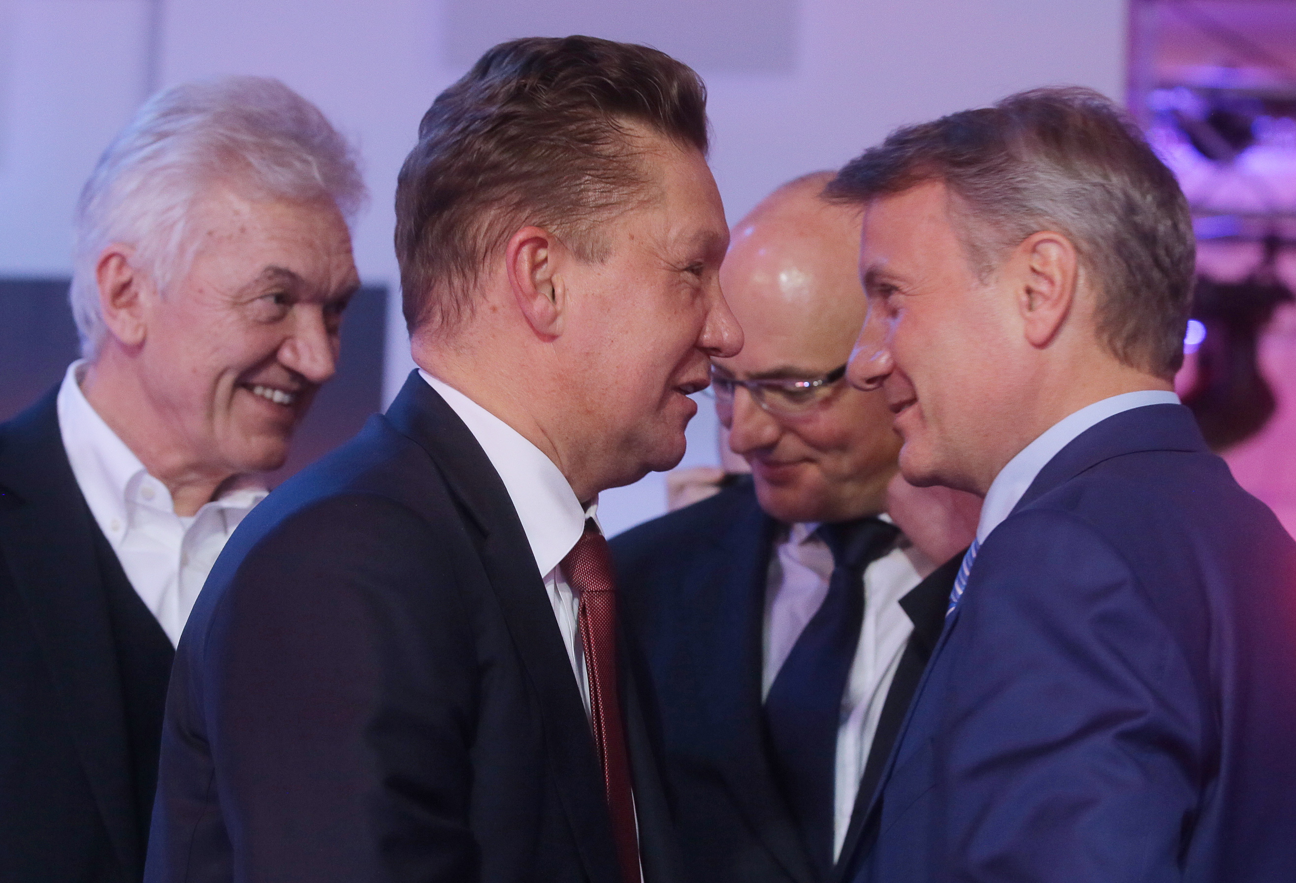 Геннадий Тимченко, Алексей Миллер, Дмитрий Чернышенко и Герман Греф на гала-ужине, посвященном презентации спортивного канала "Матч ТВ". Москва, 2015 год.