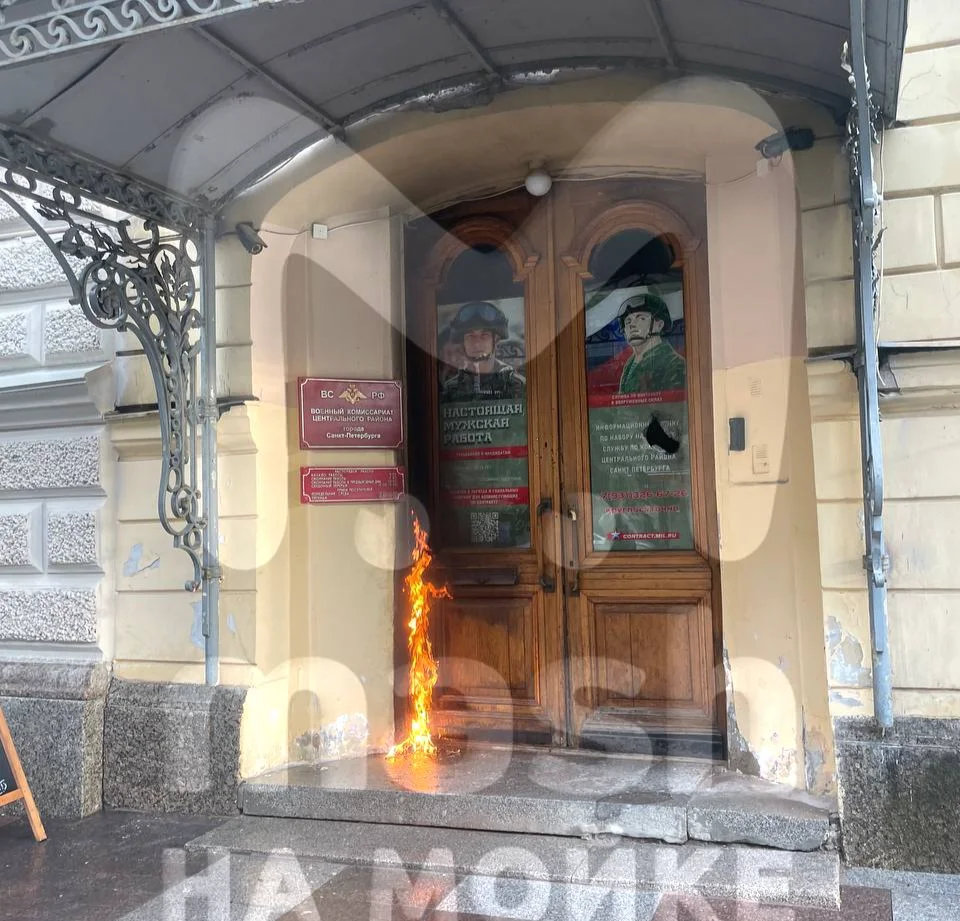 Поджог произошел примерно в 19:20. Как сообщает телеграм-канал «Mash на Мойке», мужчина бросил в дверь военкомата два коктейля Молотова.