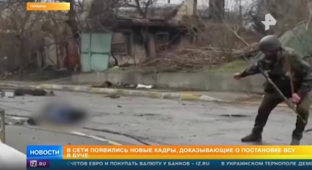 Кадр из репортажа РЕН-ТВ о том, что после ухода россиян из Бучи украинцы якобы подбрасывают на улицы тела