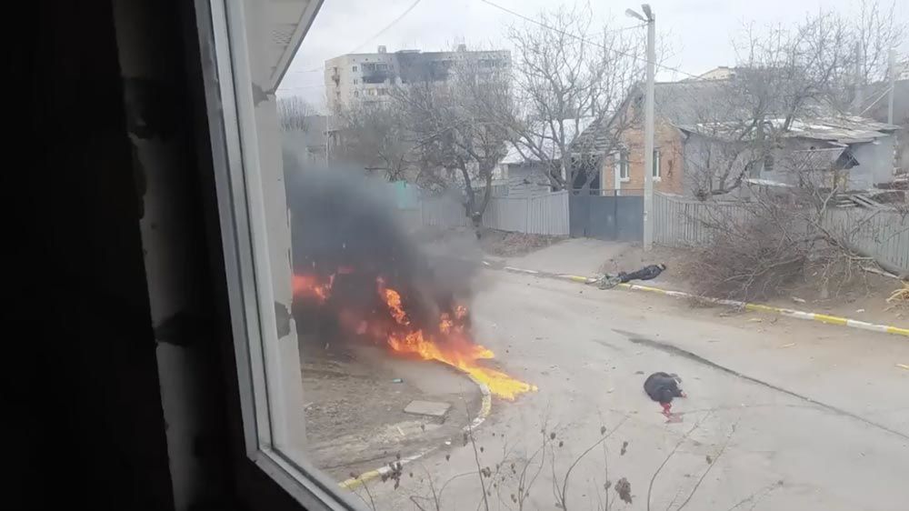 На этих кадрах — момент совершения или последствия военных преступлений российских военных в Буче, небольшом городке примерно в 15 километрах от Киева. Буча была оккупирована 25 февраля и оставлена российскими войсками 1 апреля 2022 года. За 35 дней оккупации было совершено множество военных преступлений, зафиксированных журналистами, юристами и представителями международных организаций. Два самых известных трагических эпизода оккупации Бучи — расстрелы случайных местных жителей на улице Яблонская в центре города и внесудебные казни гражданских лиц, заподозренных в связях с украинской армией.