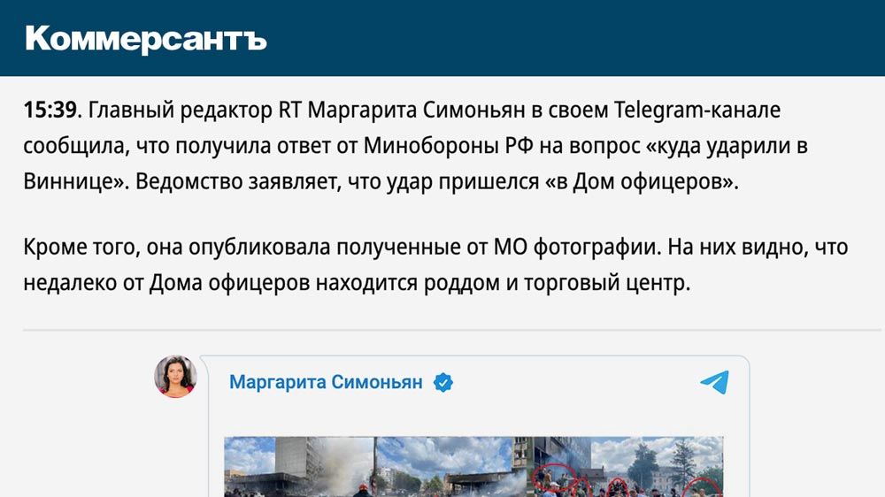 Первое упоминание обстрела Винницы на сайте «Коммерсанта» в день трагедии