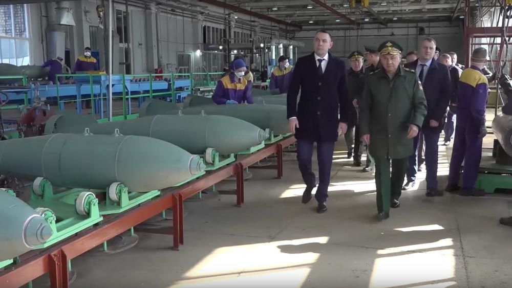 Сергей Шойгу осматривает производство бомб ФАБ-500 на заводе им. Свердлова, 6 апреля 2023. Источник: Министерство обороны России